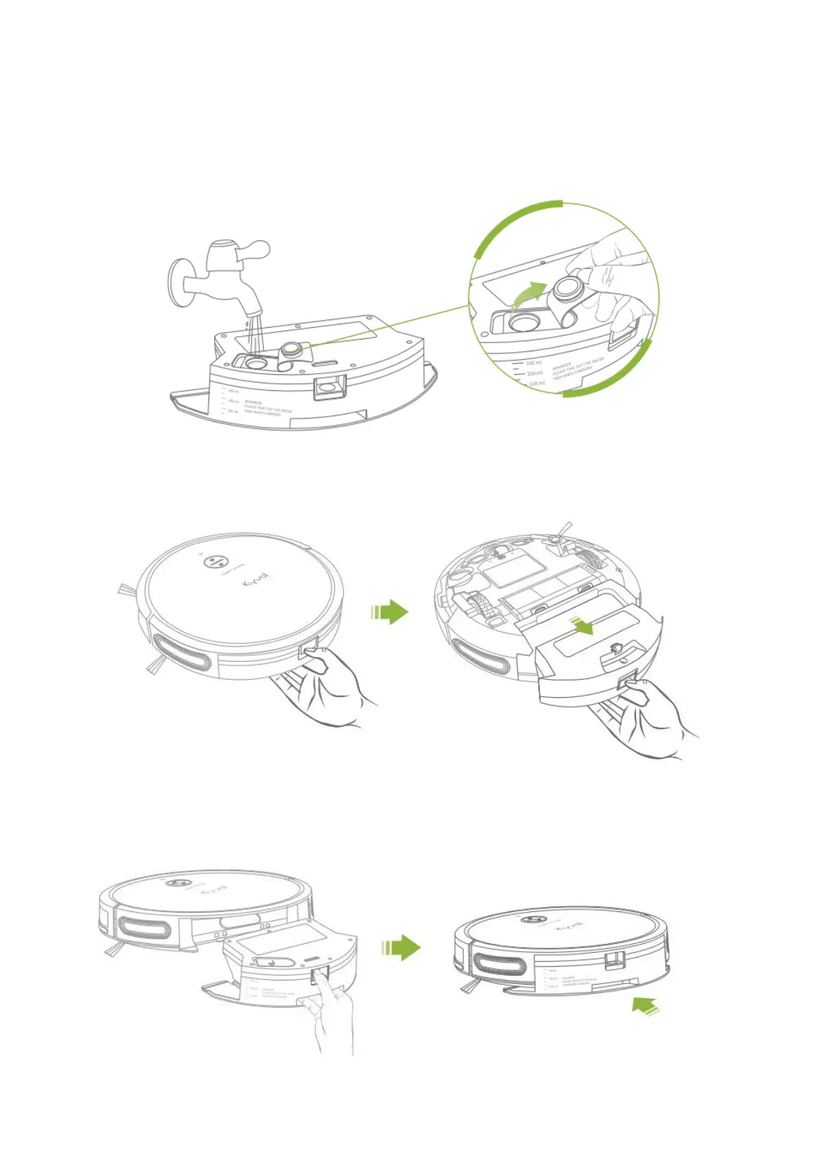 Stiskněte a podržte západku a vložte nádržku na vodu do robota.