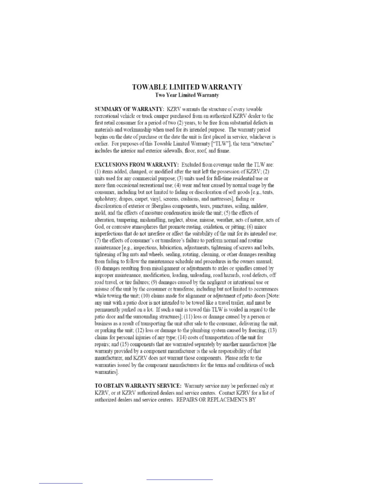 KZ Venom - Loading the Trailer-Distribution; Towable Limited Warranty