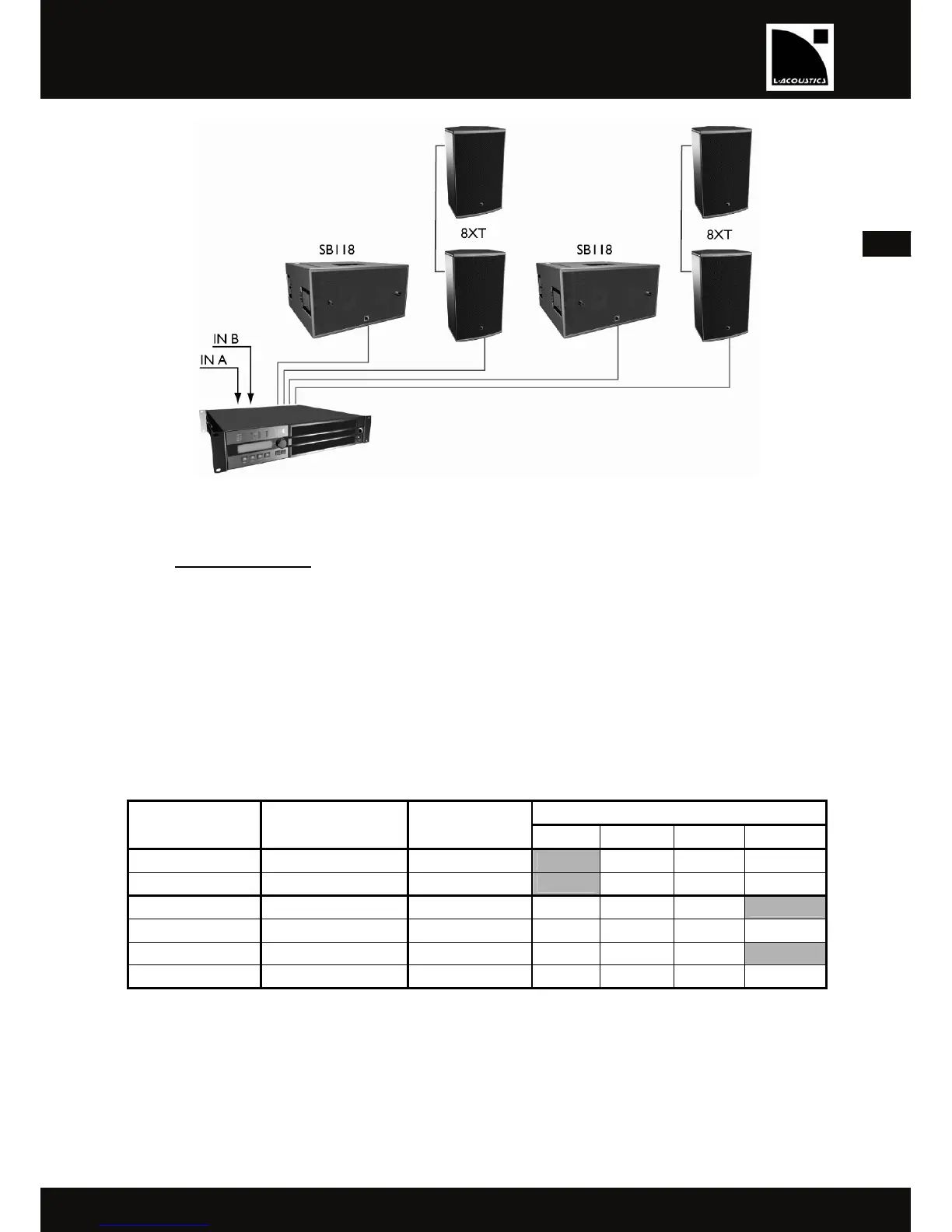 Figure 6: Two SB118 subwoofers and four 8XT enclosures connected to an LA4 controller