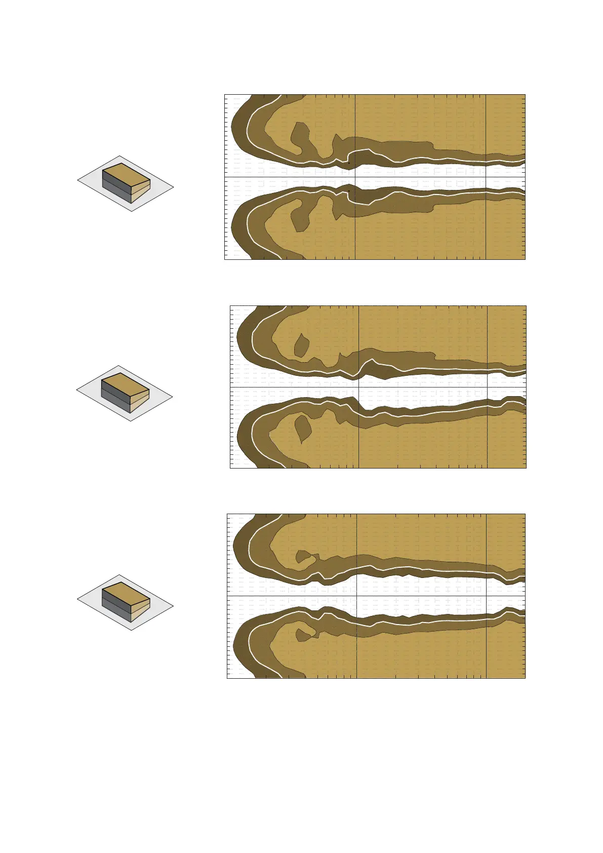 Dispersion angle diagram of a K3 array with 70° ns setting, using lines of equal sound pressure at -3 dB, -6 dB, -12 dB.