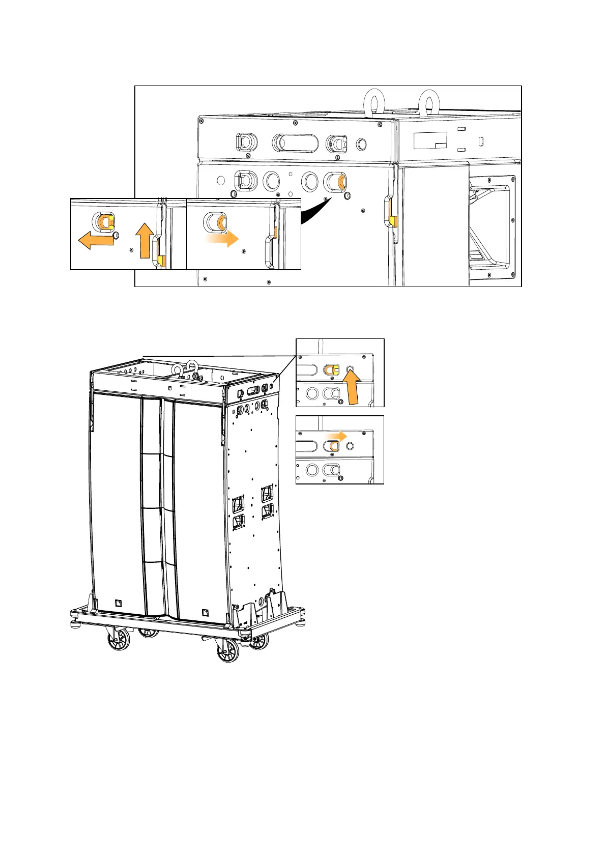 d) Pull on the rear latches of the enclosure while extending the rear rigging arms.