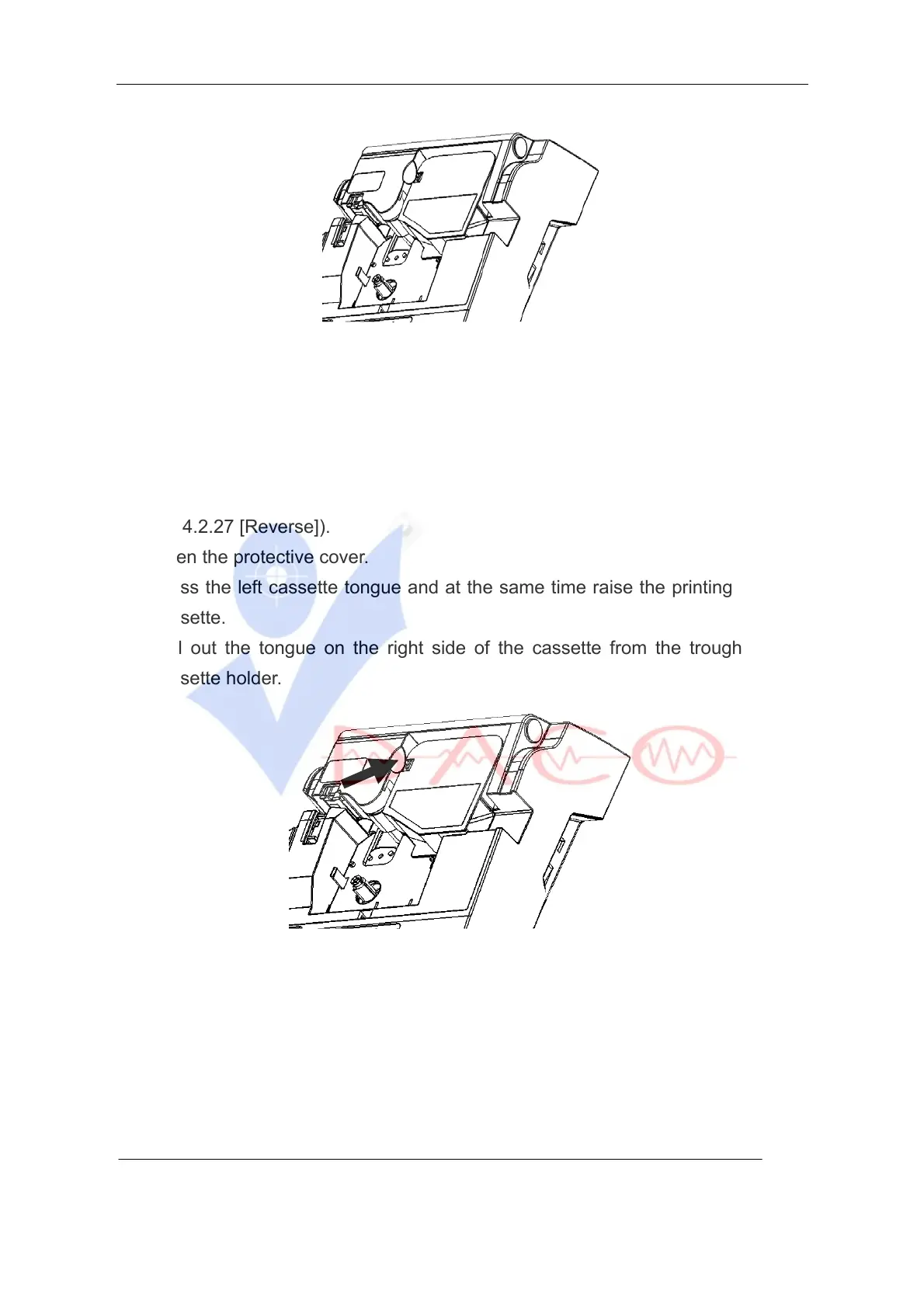 1. Prior to removing printing material cassette, please press [Reverse] key and