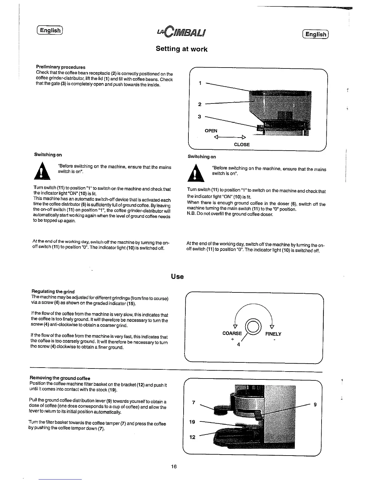 La Cimbali Junior - Setting at Work; Switching On and Operation; Grind Regulation