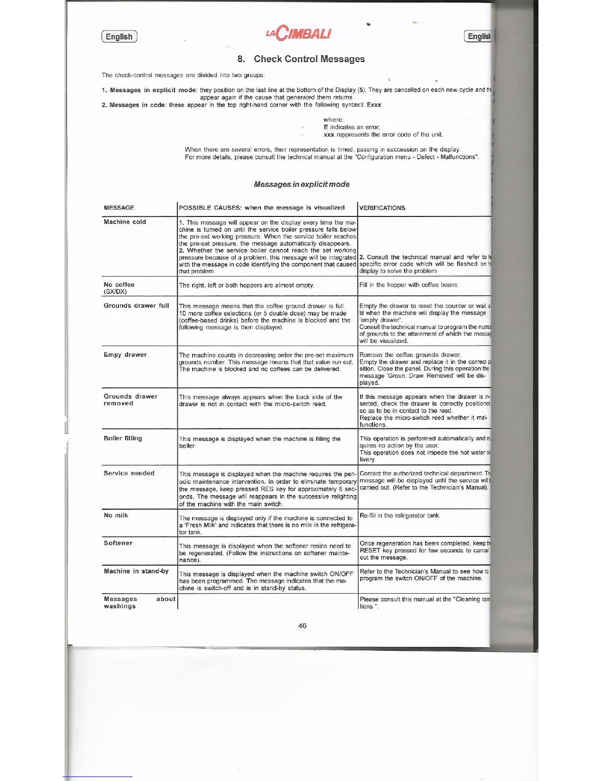 La Cimbali M2 Barsystem - System Status and Error Messages; Explicit Mode Messages; Code Mode Error Messages