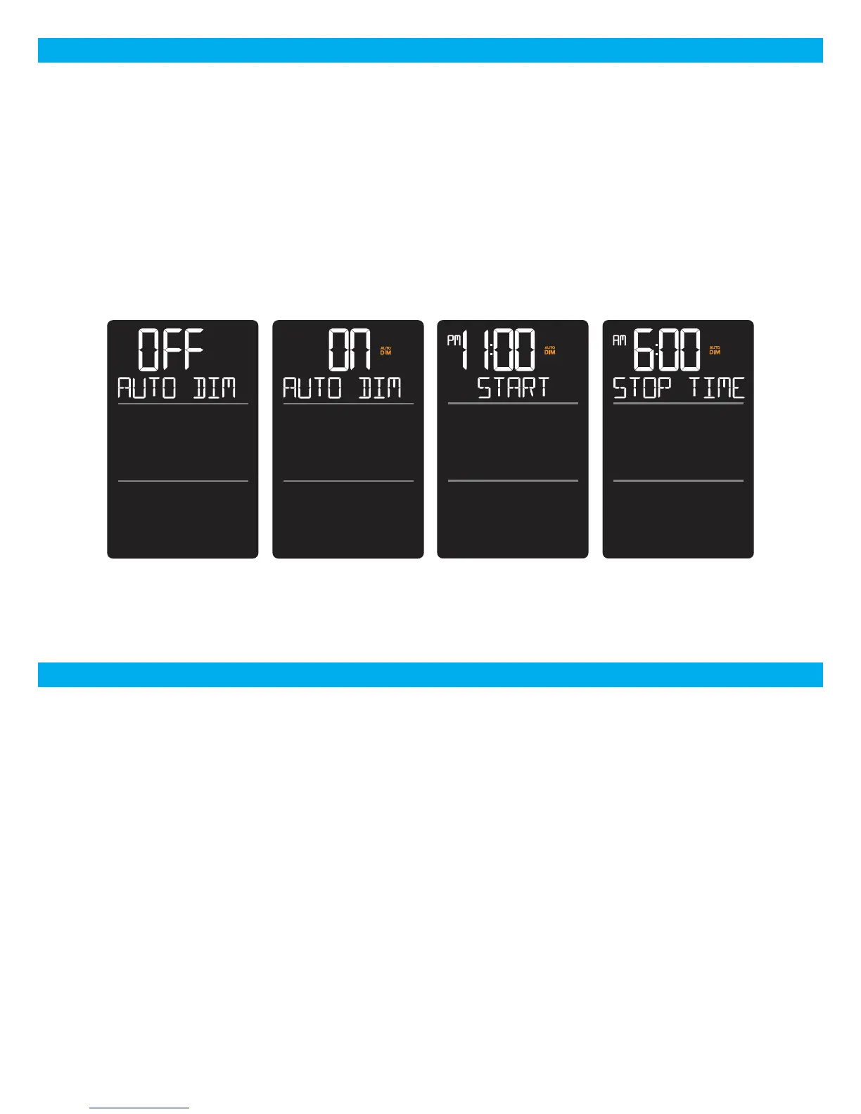 1. Hold the LIGHT button to set Auto Dim Start and Stop times.