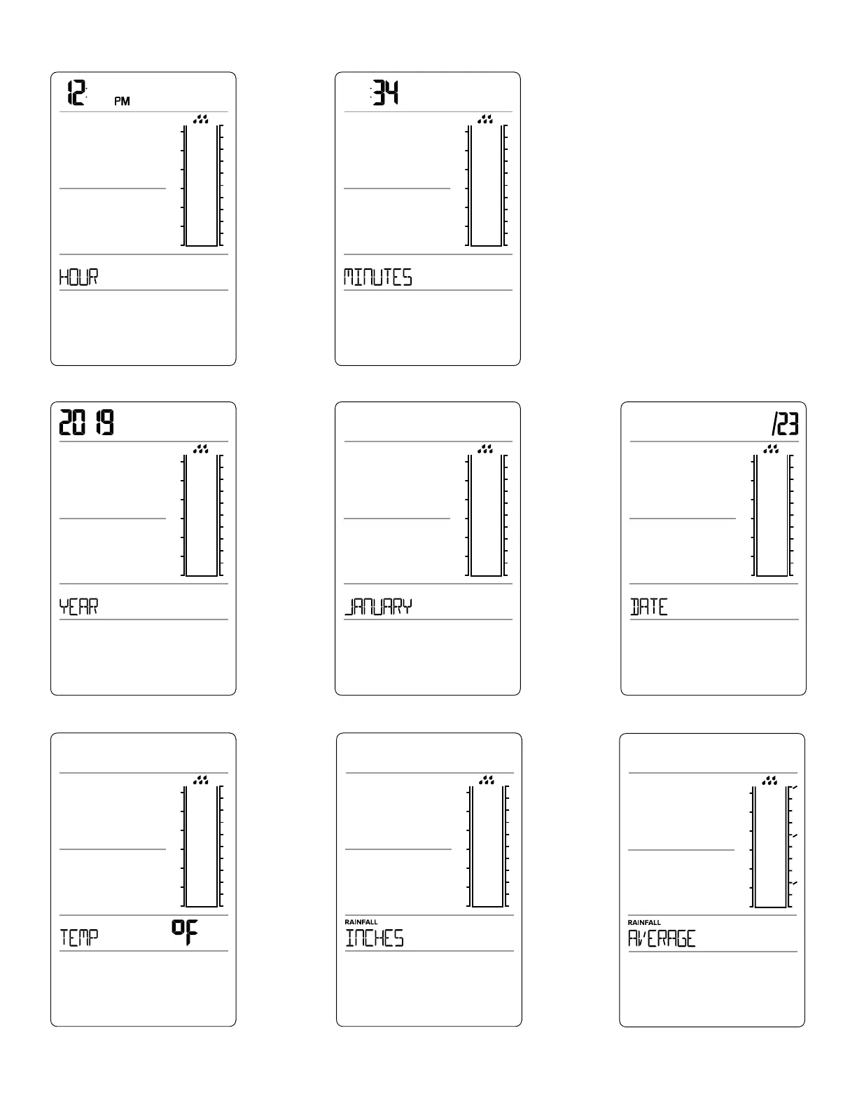 FAHRENHEIT/CELSIUS INCHES/MILLIMETERS AVERAGE/HIGH/LOW
