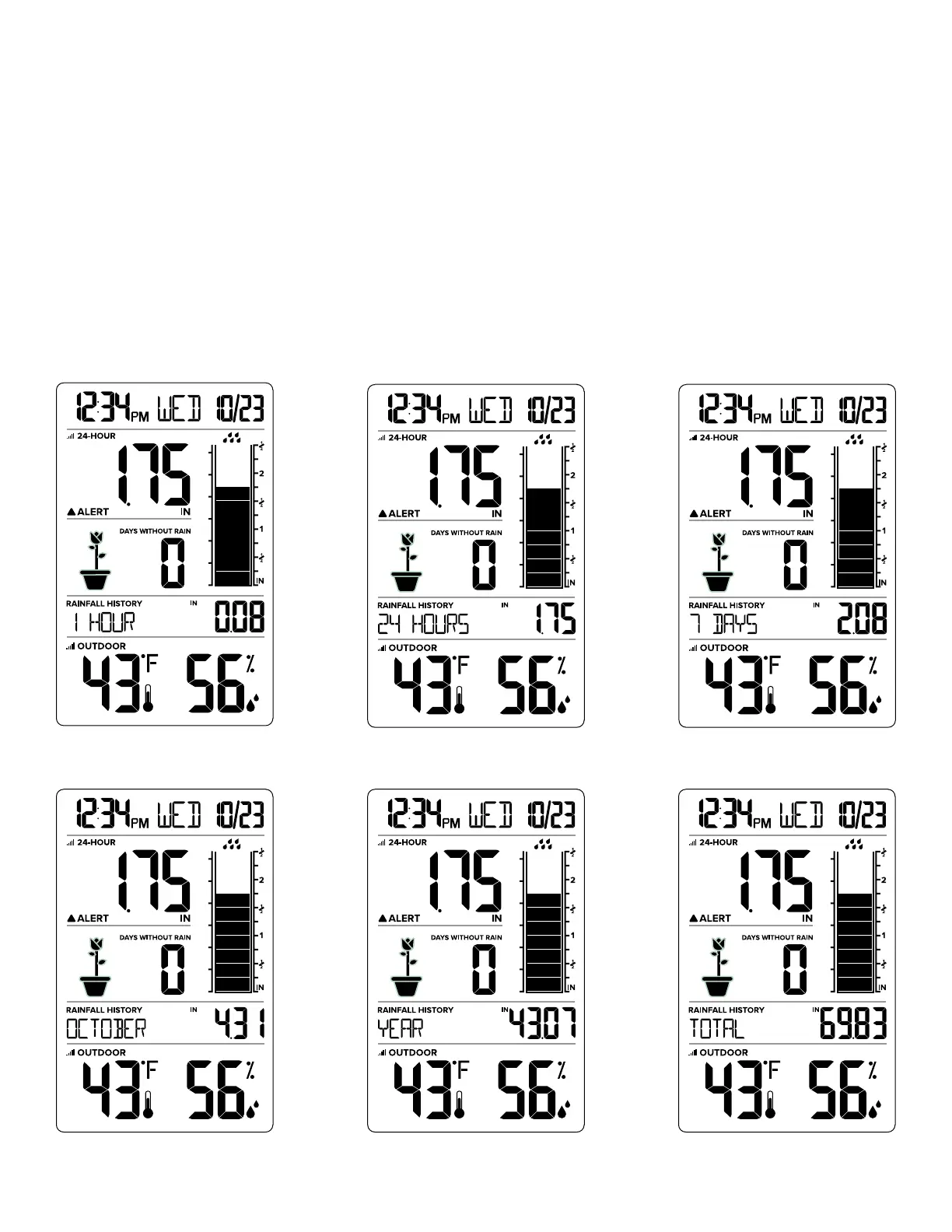 Press the HISTORY button to view MONTH Rainfall. Press and release the PLUS (+) button to toggle