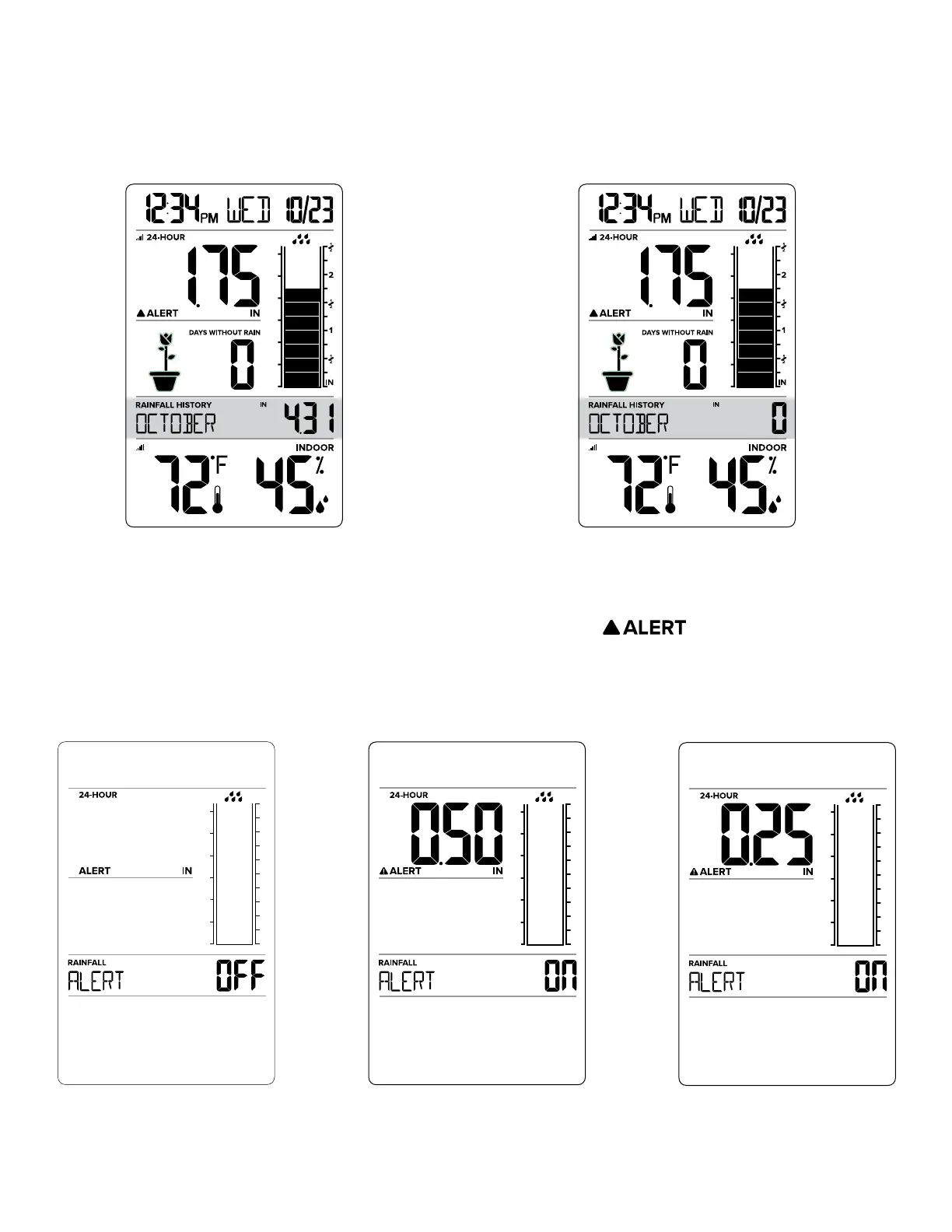 2. Press the + or – button to Arm or Disarm the Rain Alert. Alert icon will show when armed.