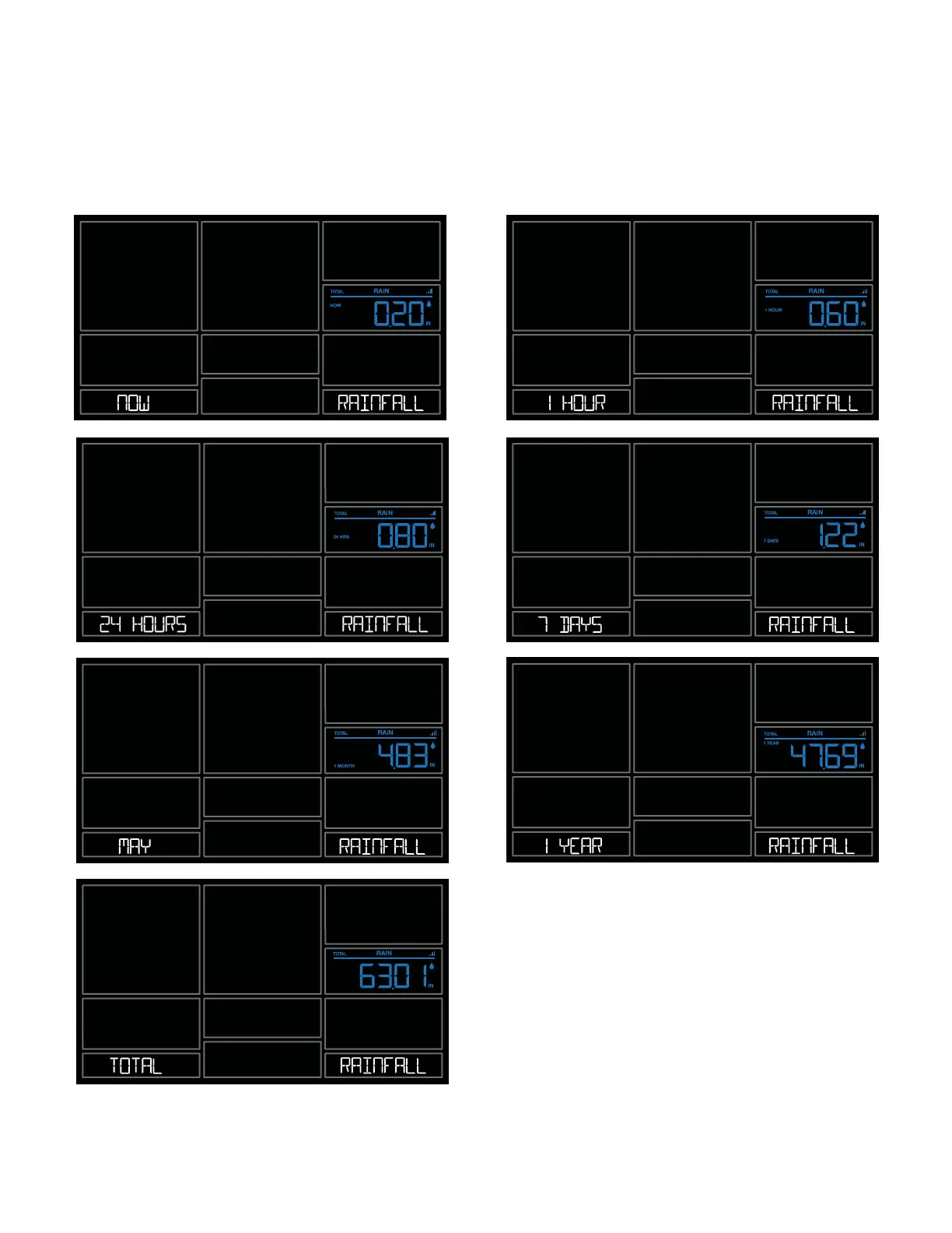Note: As time passes without rain, the 1 hour, 24 hour, and 7 day rain totals will count down to zero.