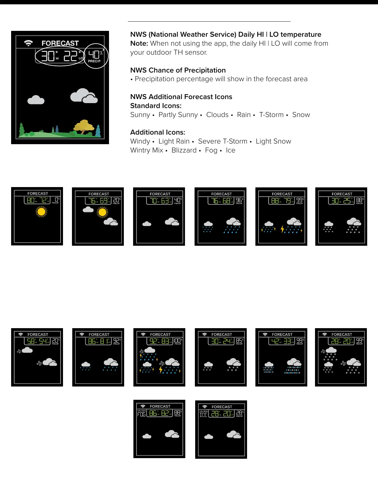 Note: Snow icon will show when the outdoor temperature is 32°F or lower and the forecast is Rain or T-Storm.