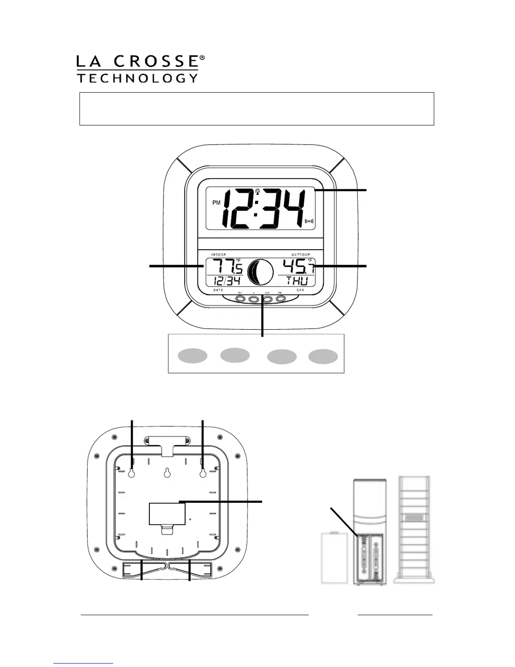 If "--.-" appears in the outdoor temperature section of your La Crosse Technology Clock's LCD, try the following: * Remove the batteries from both the clock and the sensor for ten minutes, then reinsert them with new, fresh batteries. * Move the clock closer to the sensor, ensuring it's within receivable range. * Move the units to another location, as interferences from other electrical devices operating on the same signal frequency (915MHz) may prevent correct signal transmission and reception.