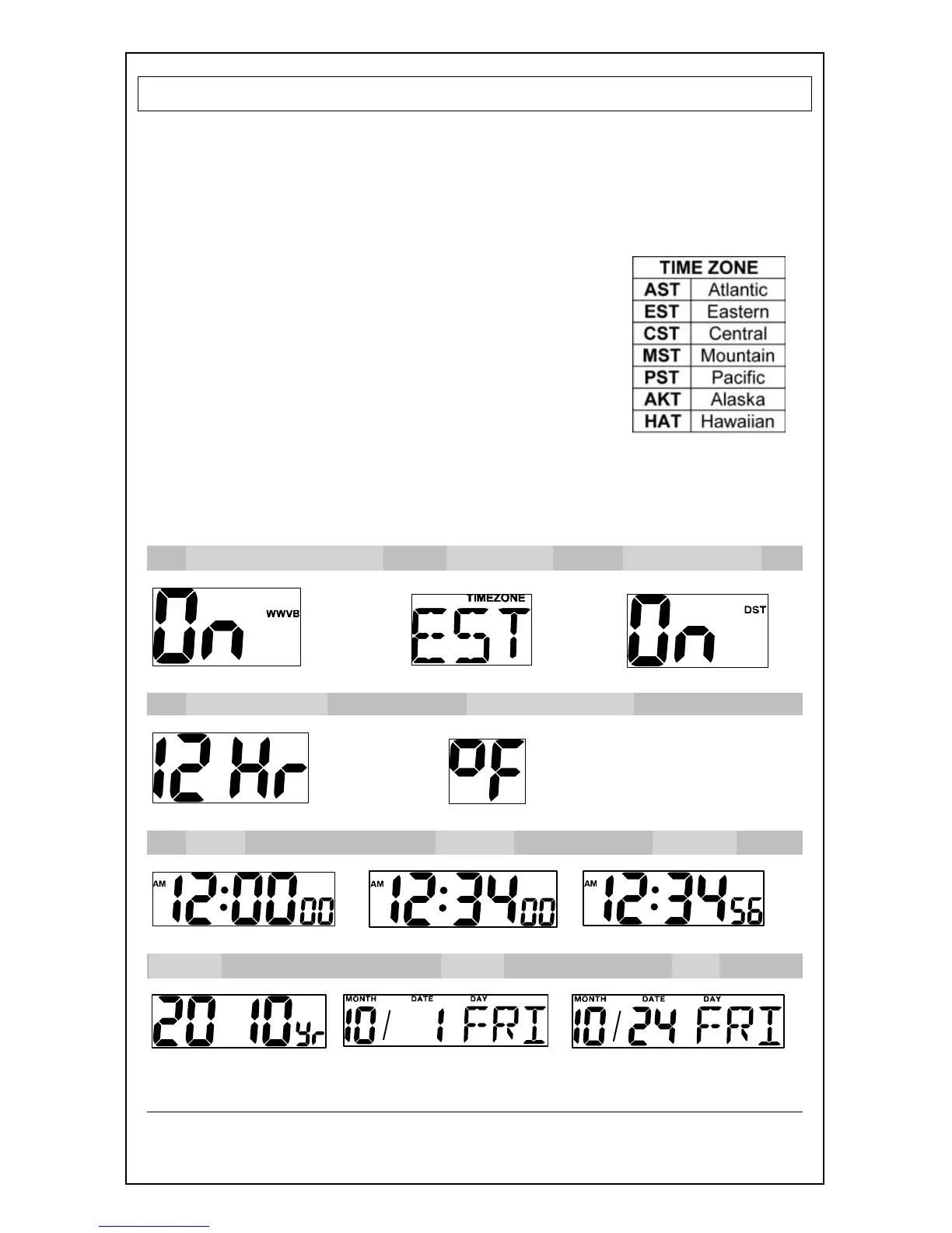 1. WWVB Time On/Off 2. Time Zone 3. DST Indicator