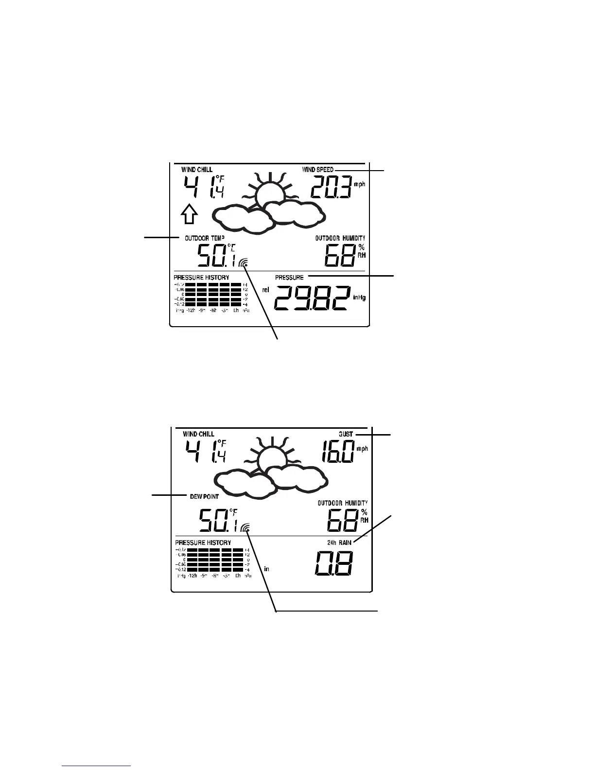 Mode 2: Wind gust, dew point, and rainfall (optional) reading are shown.