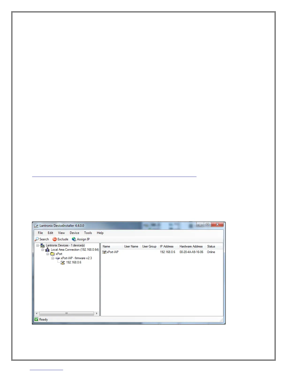 device is powered when you run the DeviceInstaller it will automatically begin a search and find the