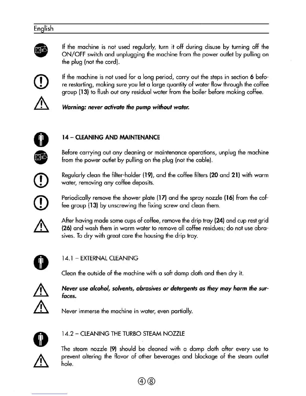 La Pavoni Cellini - CLEANING AND MAINTENANCE; EXTERNAL CLEANING; CLEANING THE TURBO STEAM NOZZLE