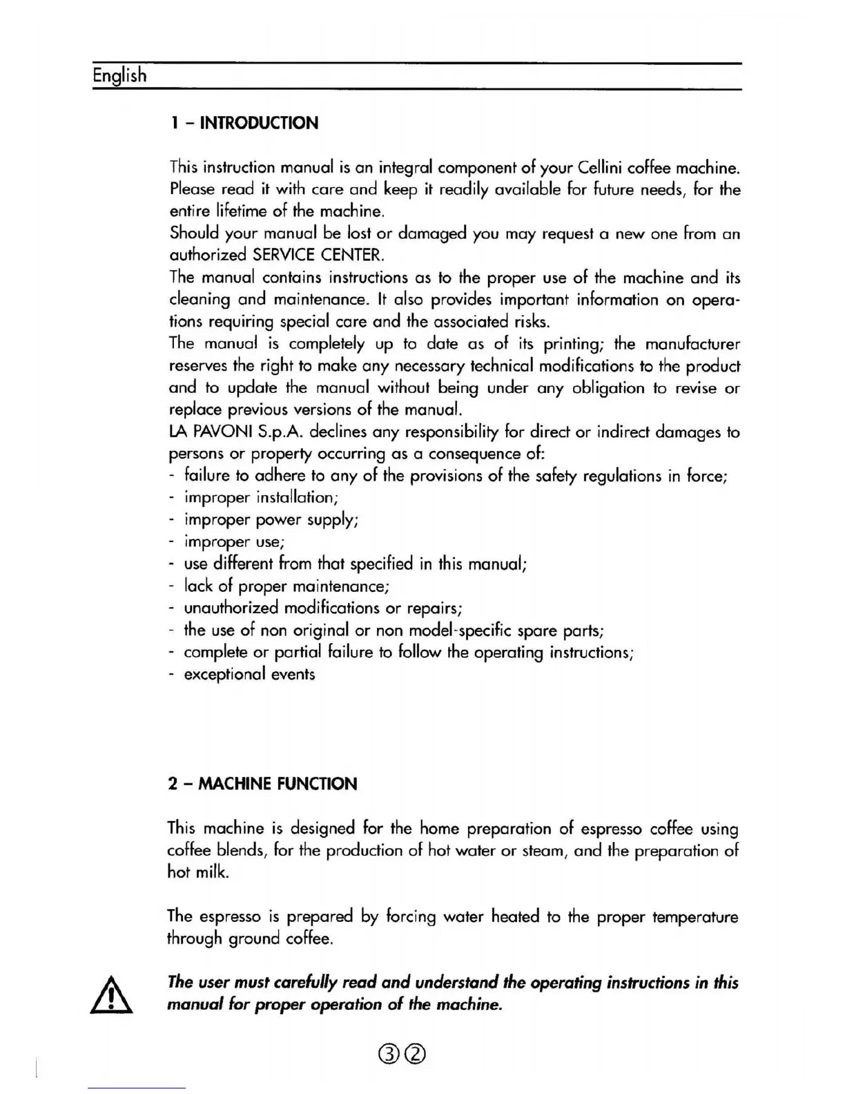La Pavoni Cellini - INTRODUCTION; MACHINE FUNCTION