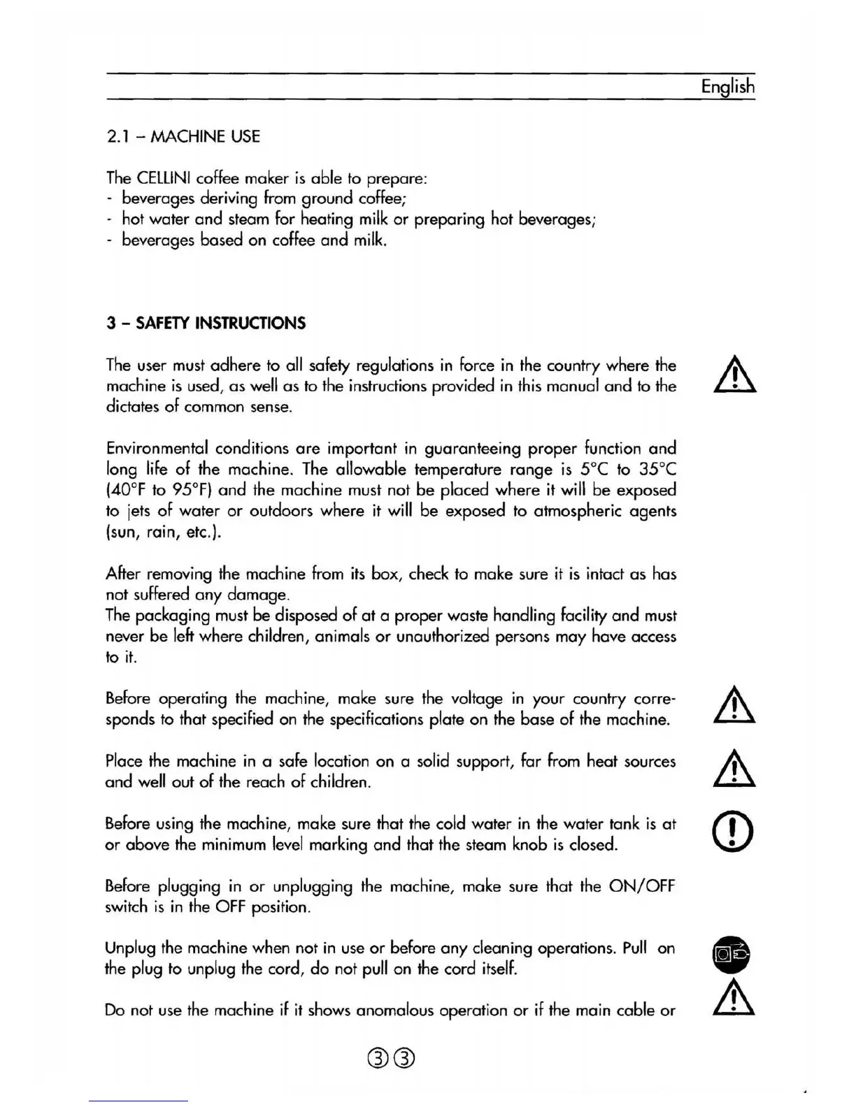 La Pavoni Cellini - MACHINE USE; SAFETY INSTRUCTIONS
