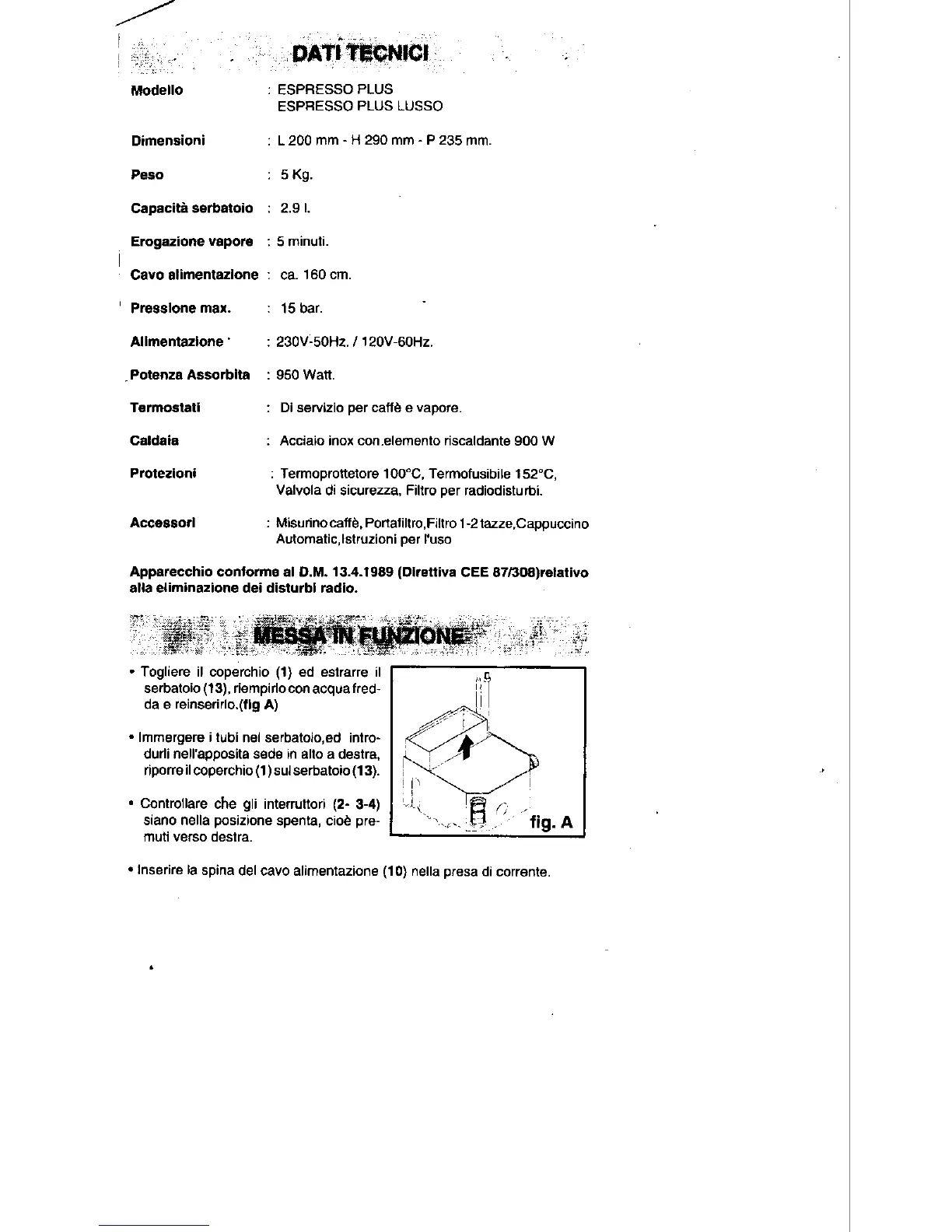 La Pavoni Espresso Plus - DATI TECNICI; MESSA IN FUNZIONE