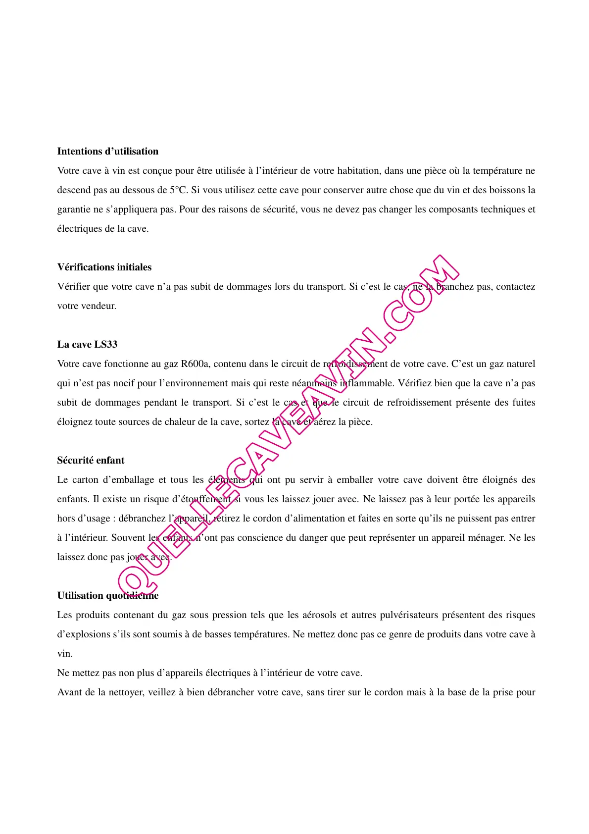 descend pas au dessous de 5°C. Si vous utilisez cette cave pour conserver autre chose que du vin et des boissons la