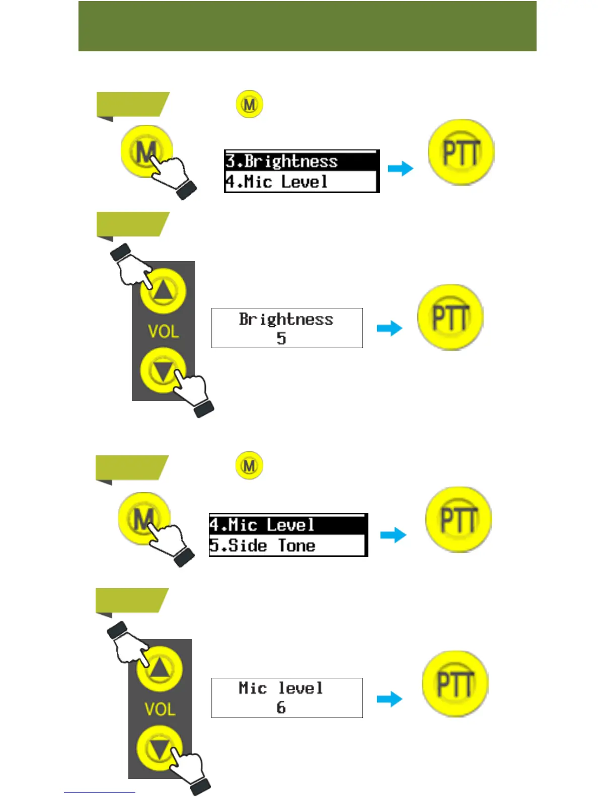 Press&hold button to go to menu and then select “ 3. Brightness .