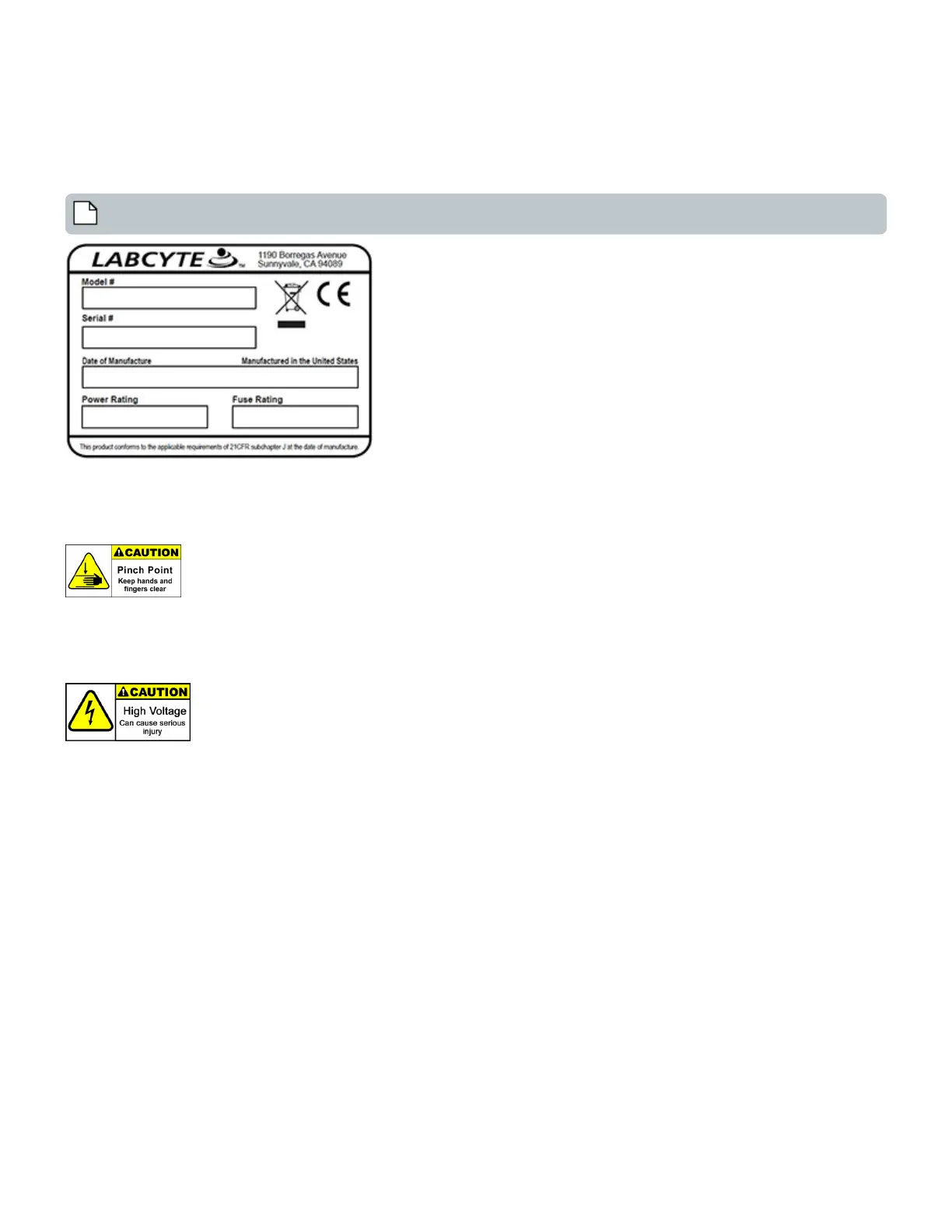 The high-voltage label warns of possible high-voltage injury from electrical cables, connections, and circuits inside the Echo Liquid