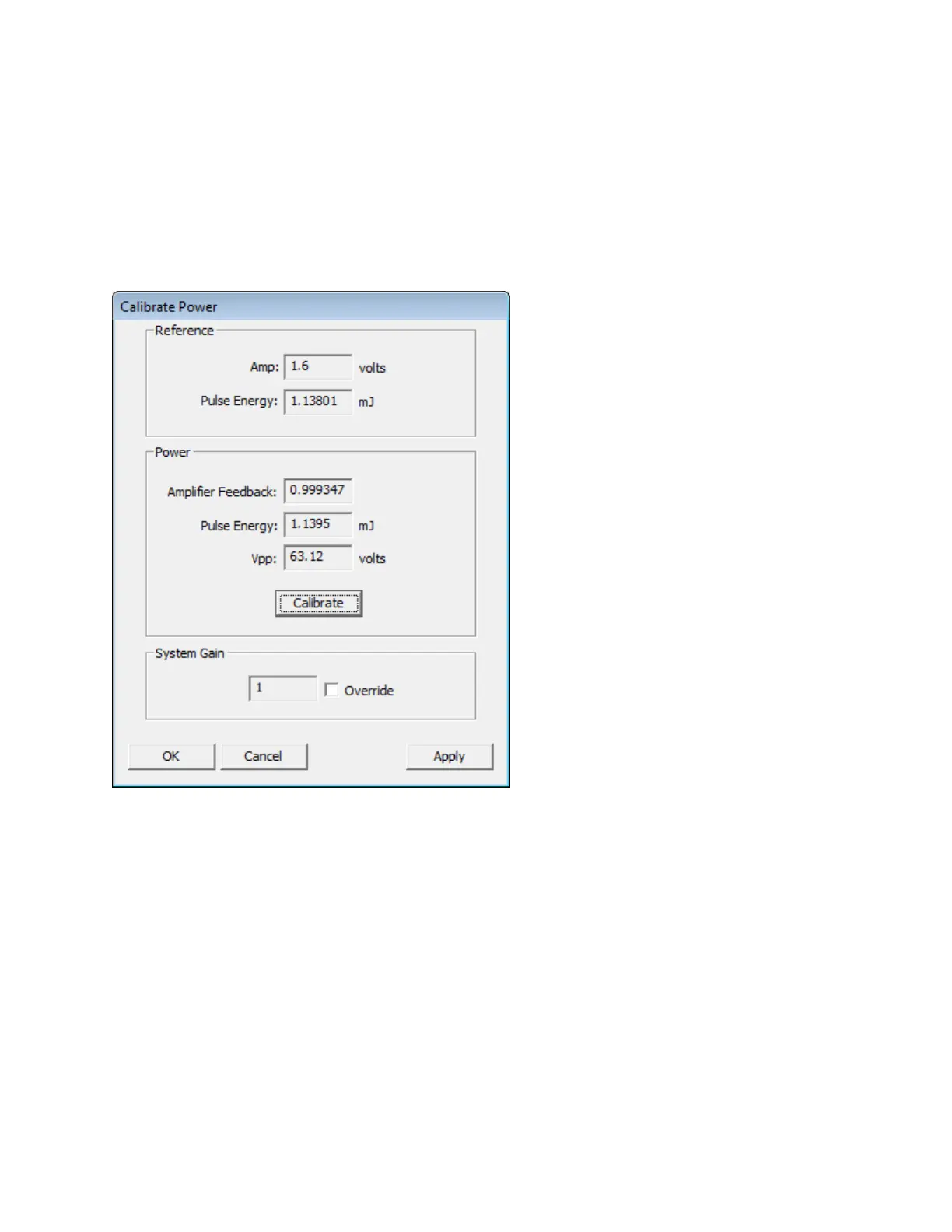 OK: The OK button applies the new Amplifier Feedback value and/or the new System Gain value and closes the Calibrate