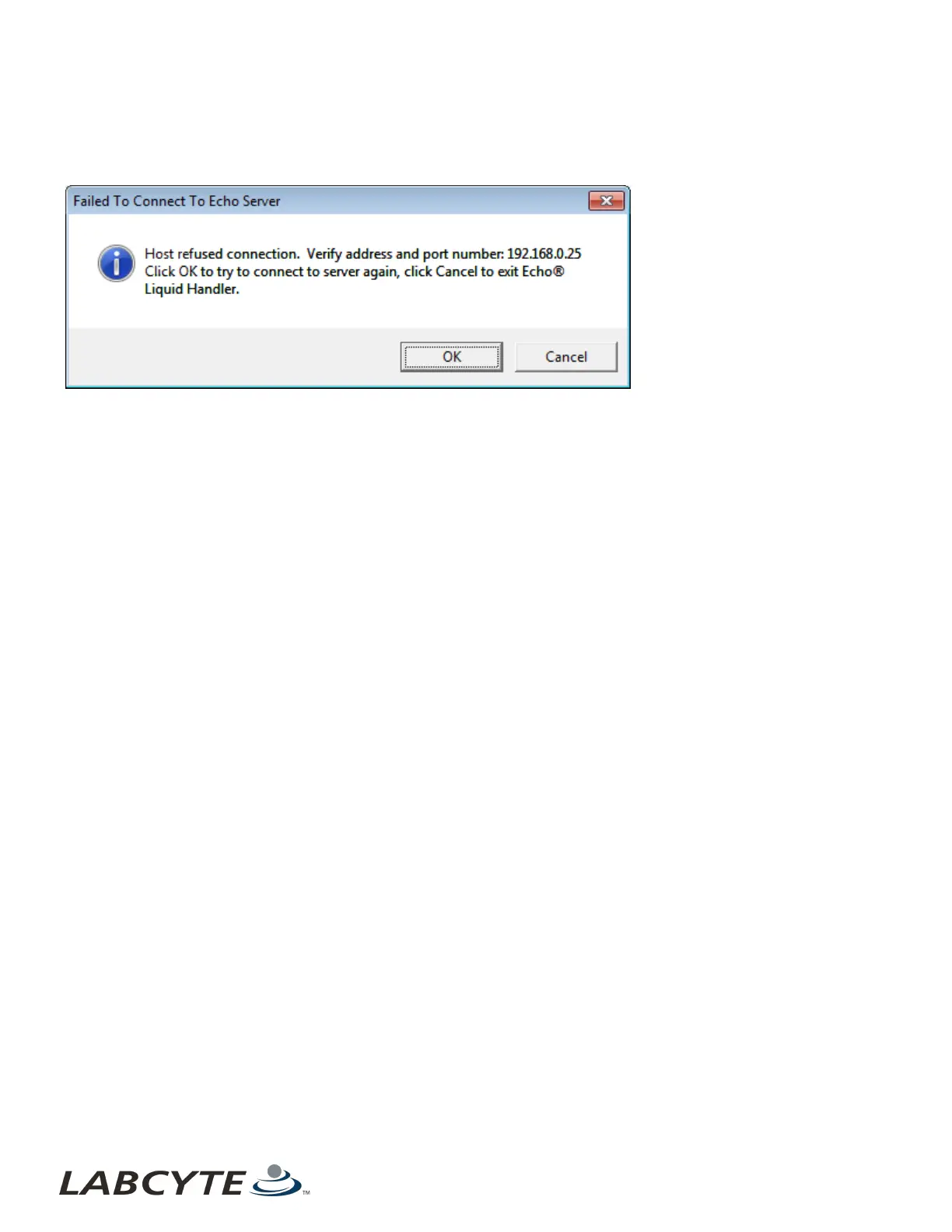 l The Echo Liquid Handler software is not configured (IP address or hostname) to connect to the instrument.