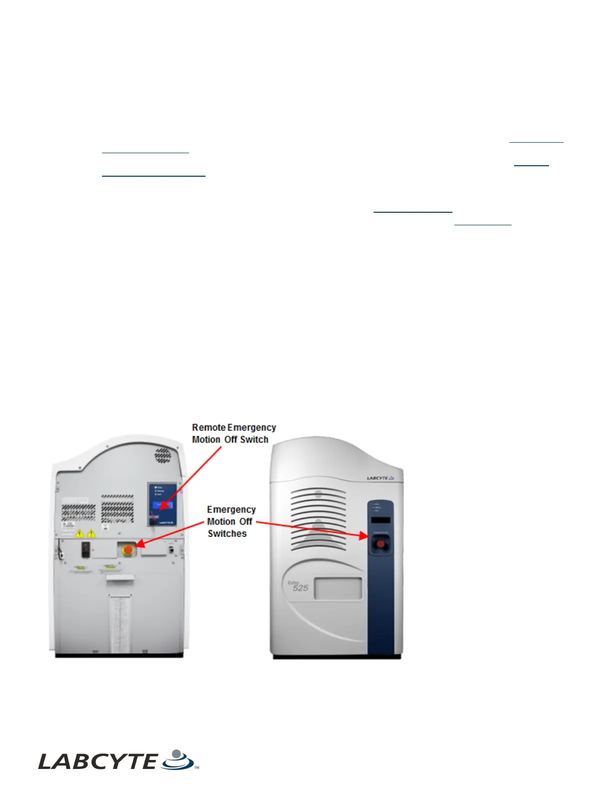 down all mechanical activity in the Echo Liquid Handler. There are two Emergency motion off switches, one on the front panel and