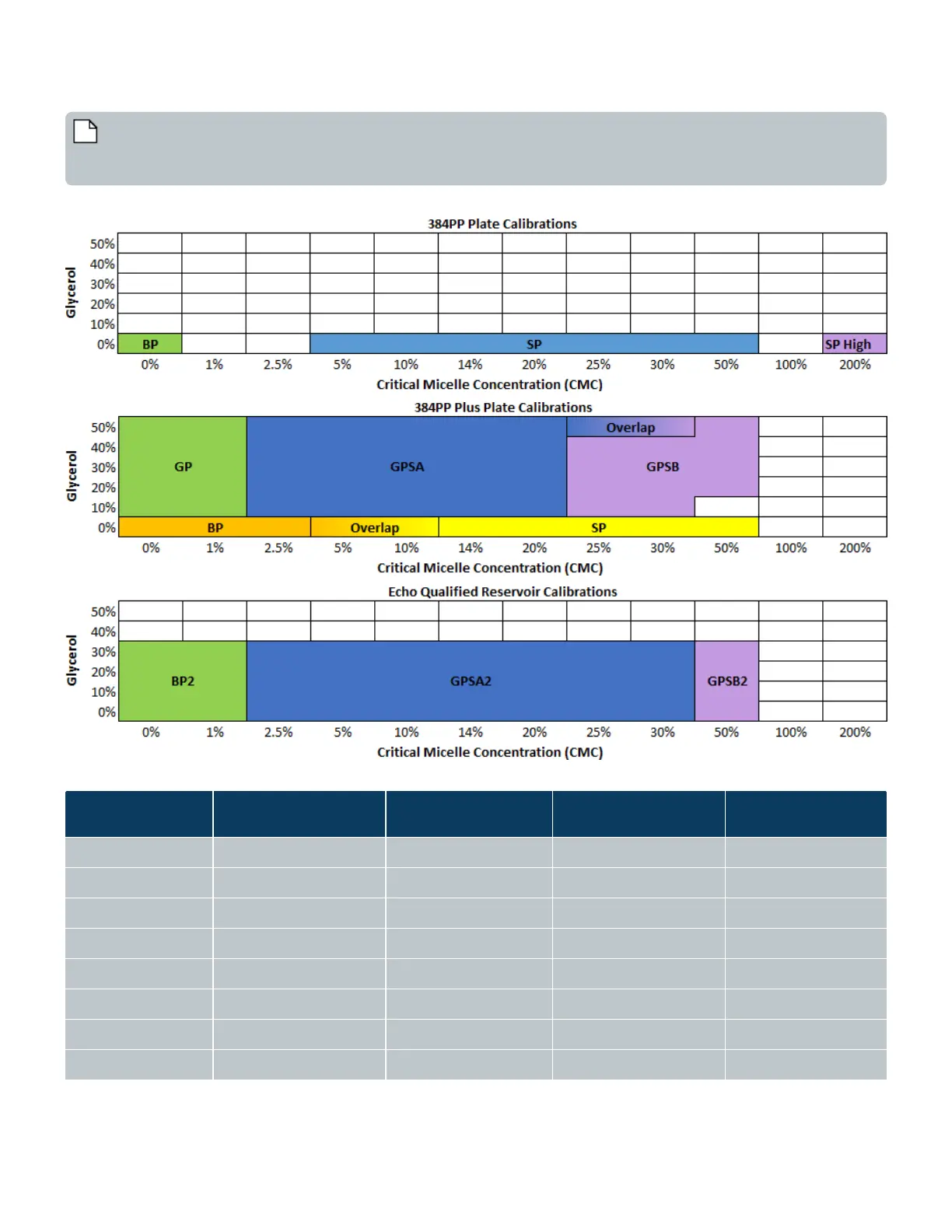 The tables below illustrate the glycerol and CMCpercentage ranges for each plate calibration.