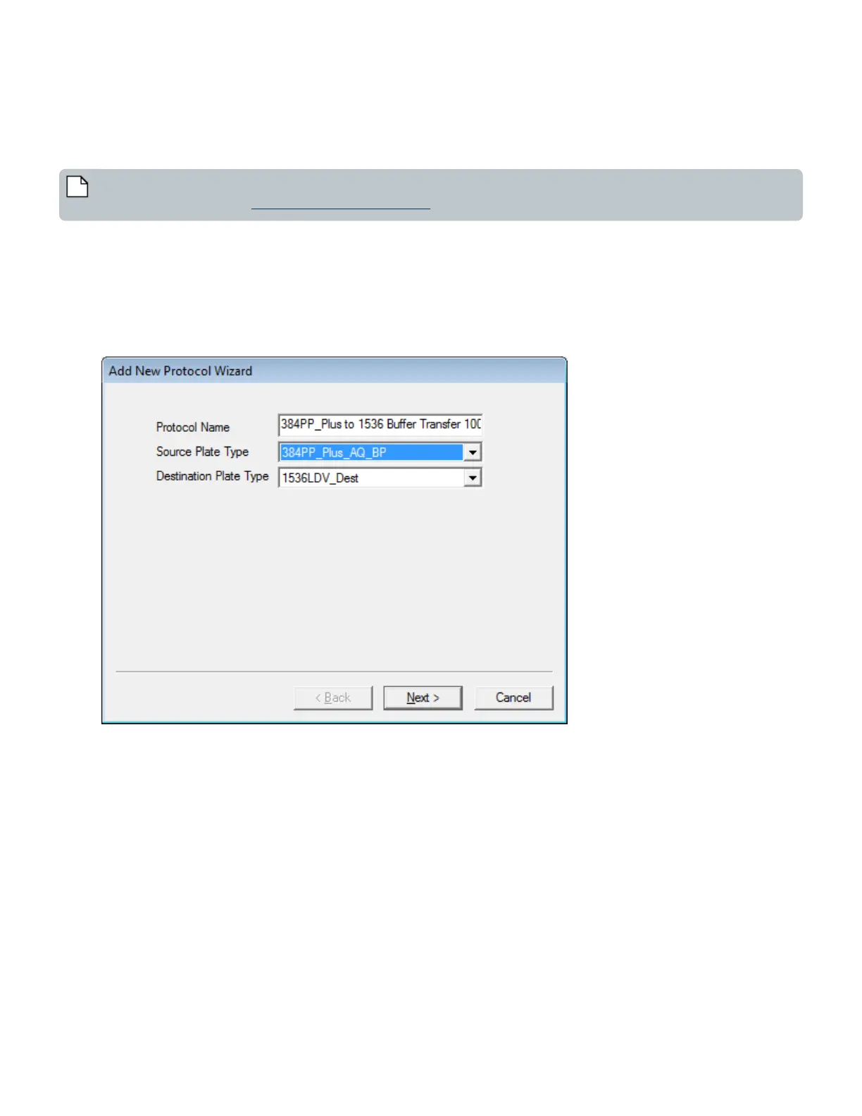 1. Click the Add button to start the Add New Protocol wizard. Enter the protocol name (for example, 384PP Buffer Transfer)