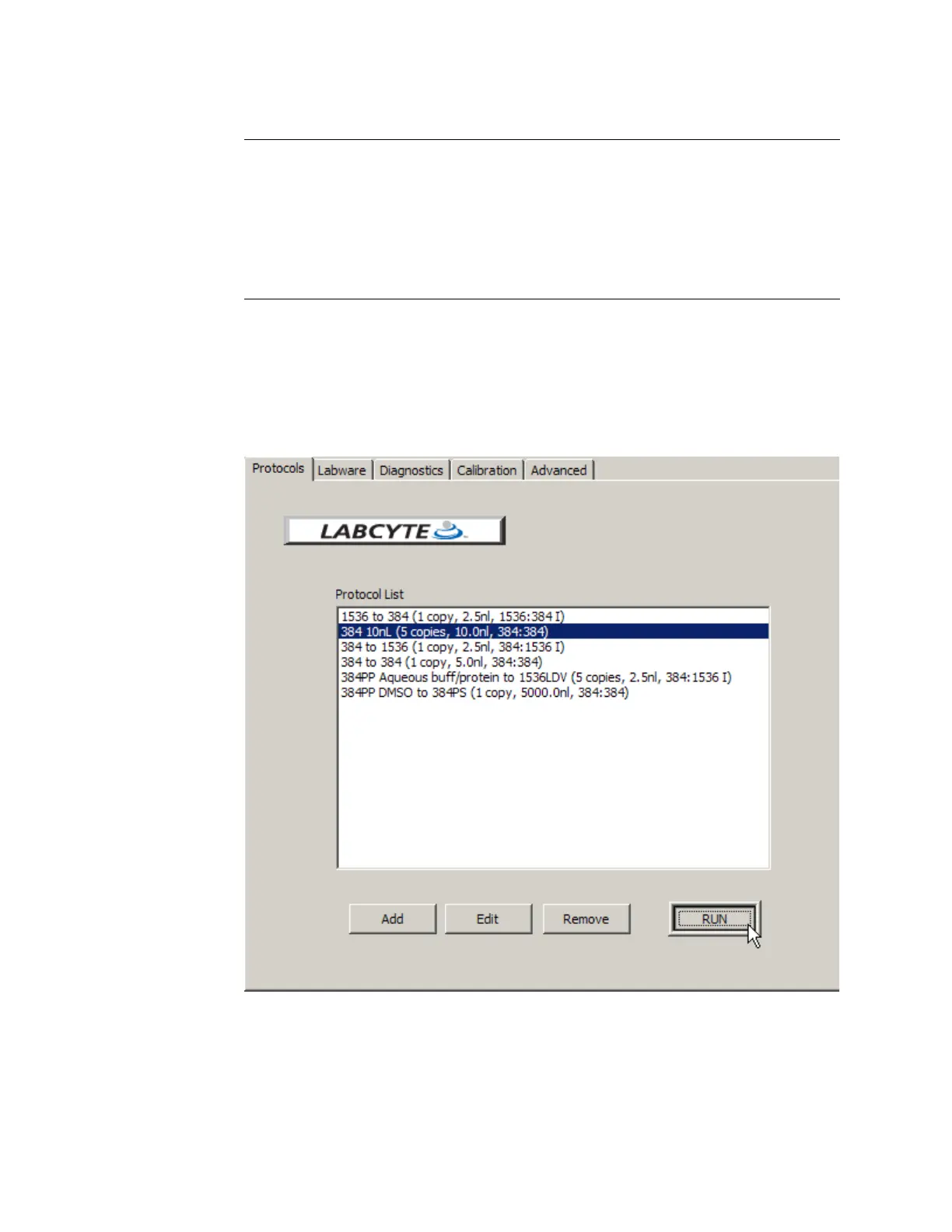 1. From the PROTOCOLS window, select the protocol to be run and click the