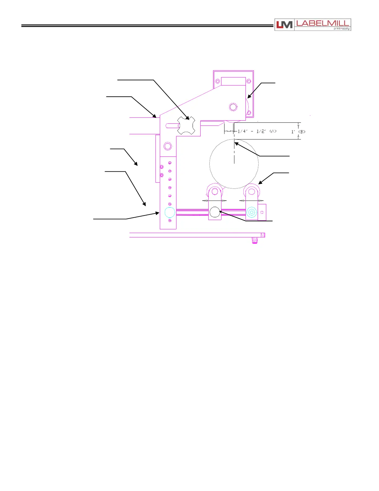 ¼" - ½" (A) gap between the application roller (Q) and the peeler plate (P).