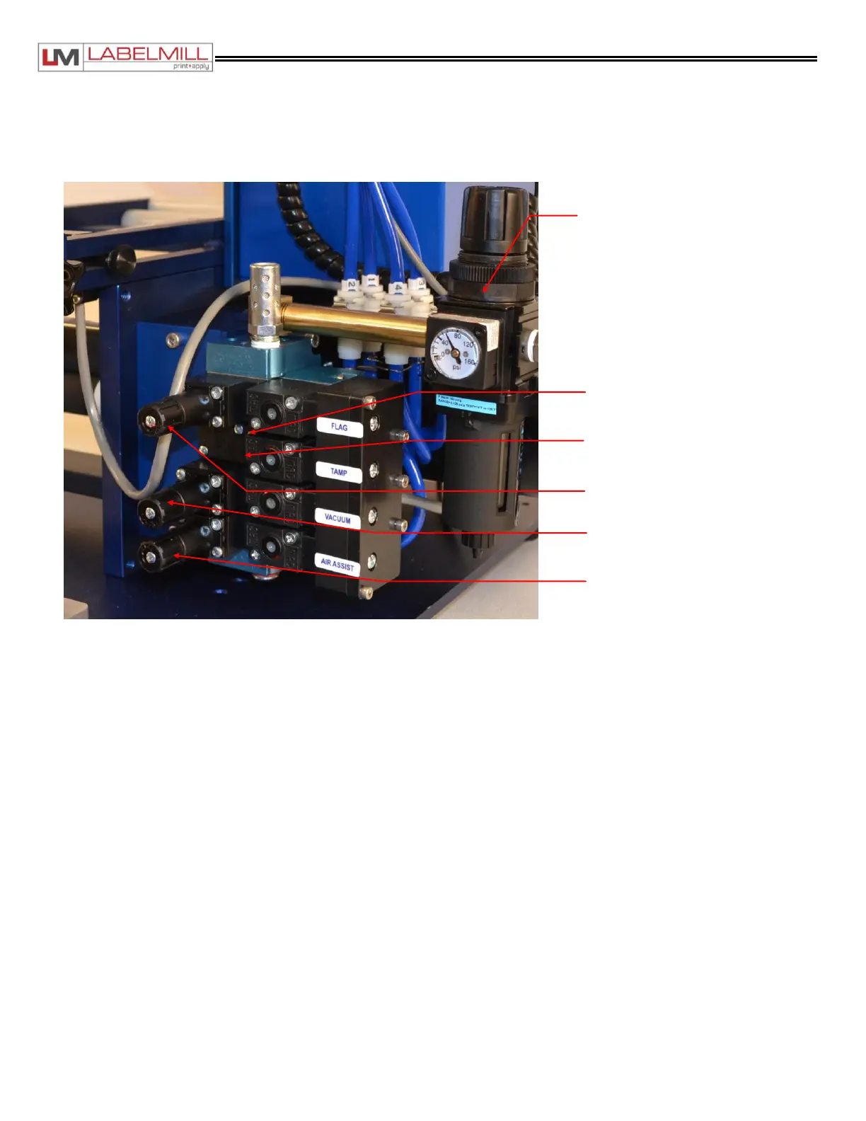 The vacuum regulator is used to control the vacuum that is used to hold the label to the flag jaws or the tamp pad.
