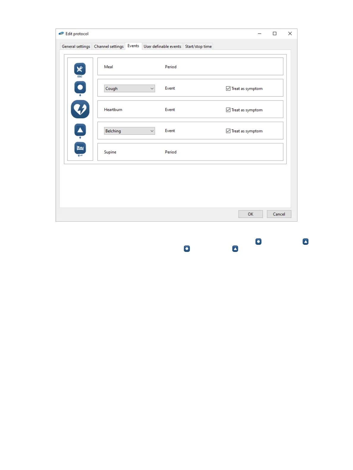 Using the corresponding prepopulated drop-down lists, you can assign a symptom to the button and the button.