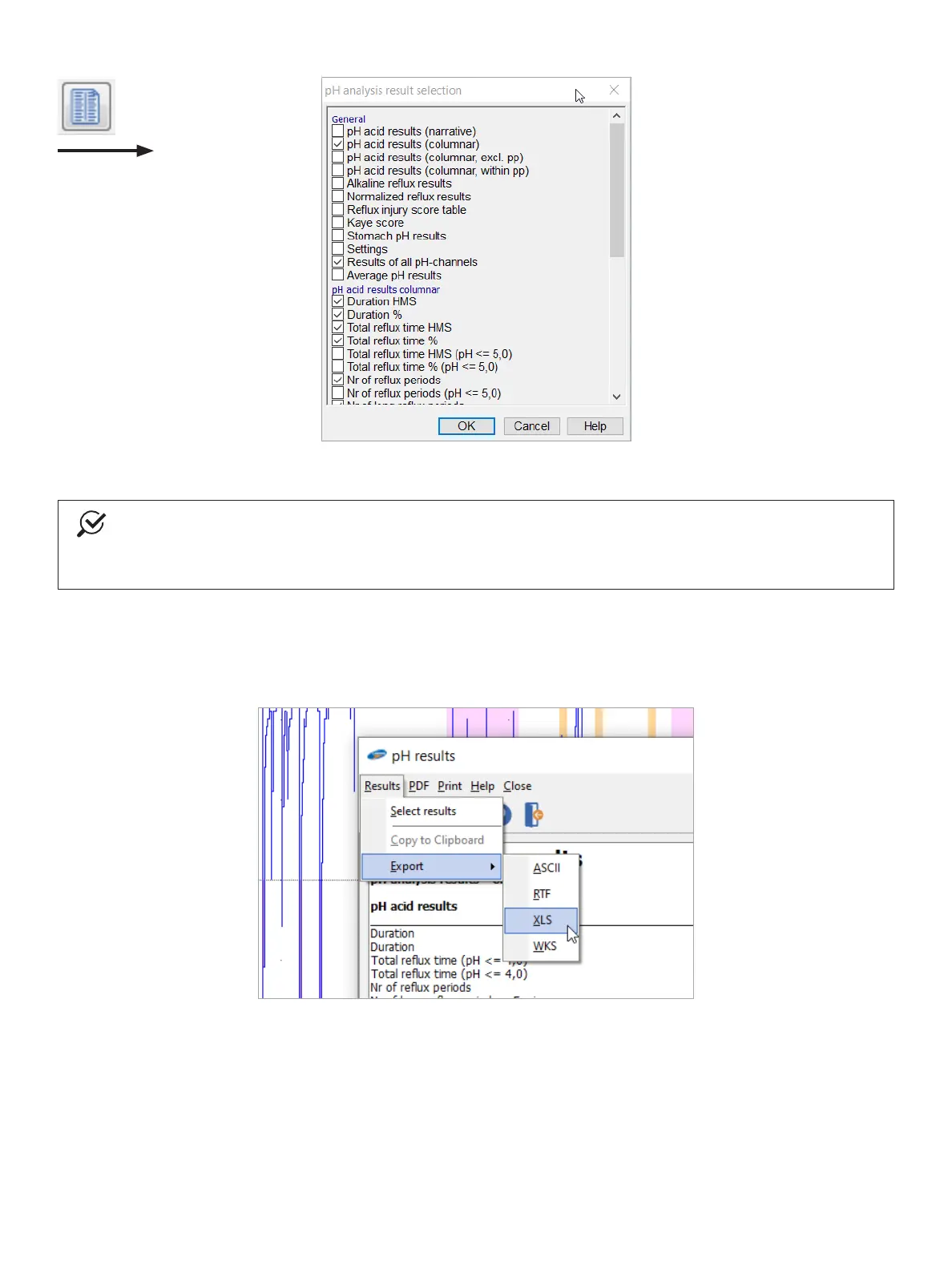 In the pHanalysis and Symptom results dialog boxes, choose Results > ExporttoexporttheresultstoaleinASCII,