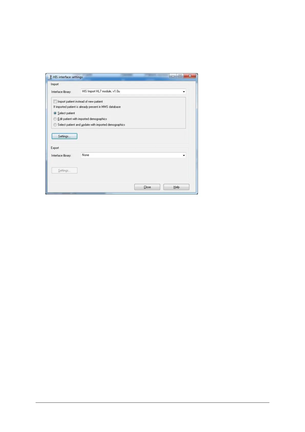 Select the correct HIS interface library from the drop-down menu (i.e. HL7 or
