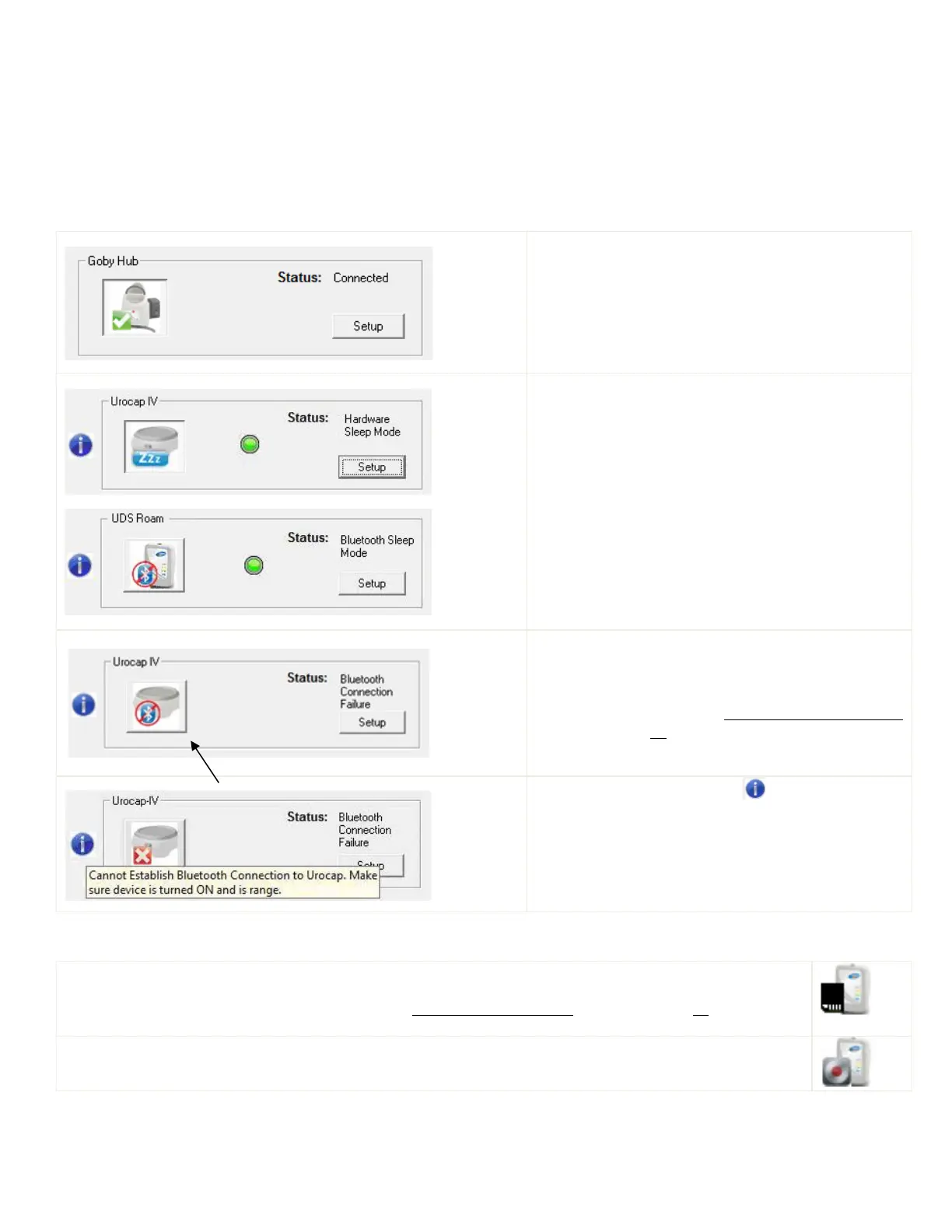 Icon indicators in the Goby Device Manager window will display the status of a device in addition to battery status. The