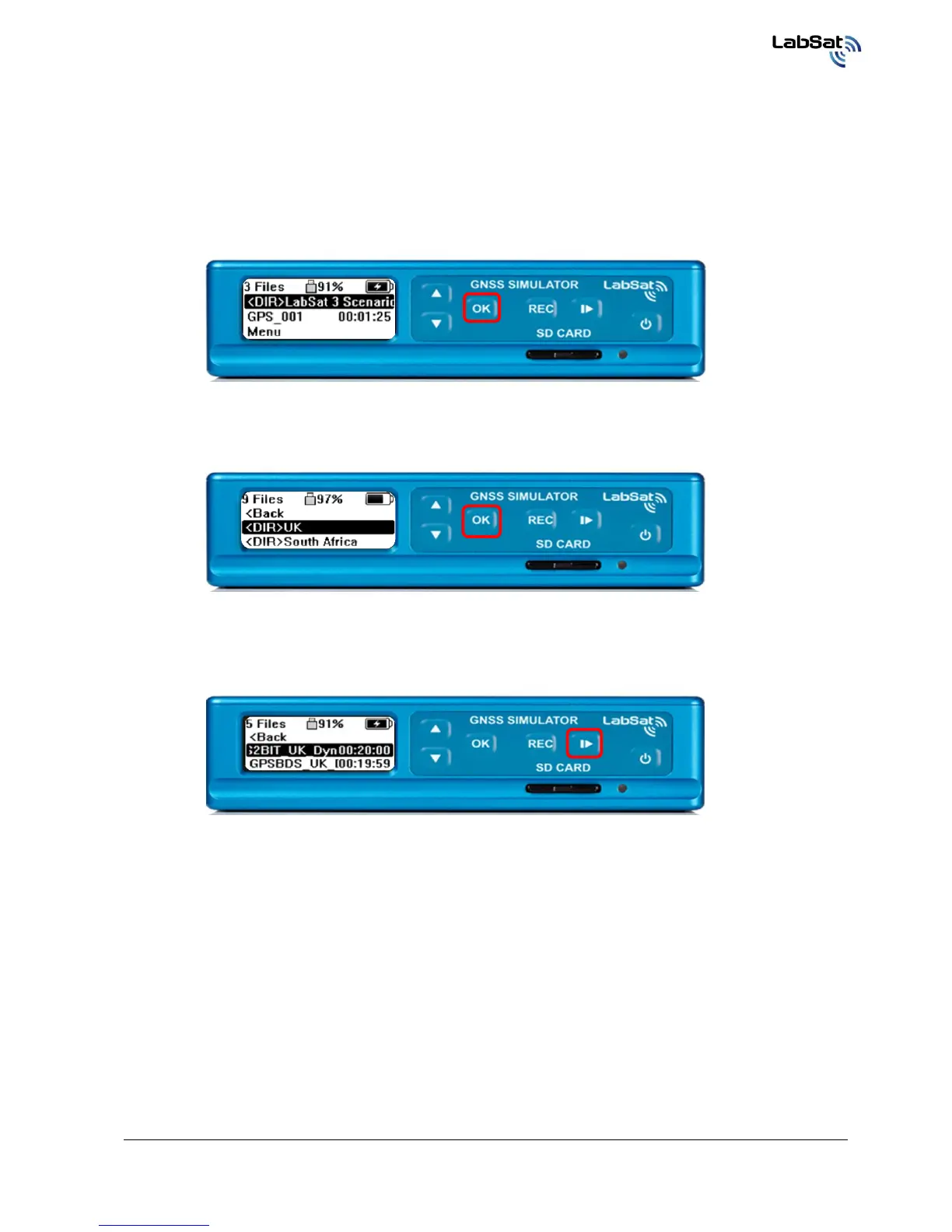 When USB media is connected LabSat 3 will scan for files and display the files/folders containing the .ls3