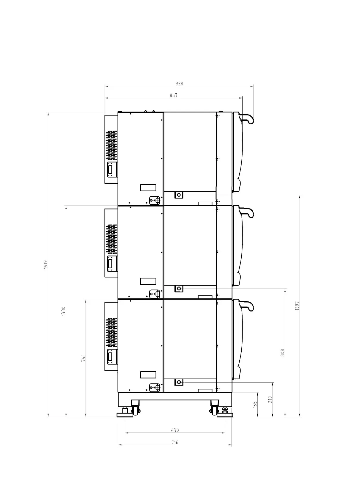 Side view of 3 units stacked with low base with doors closed