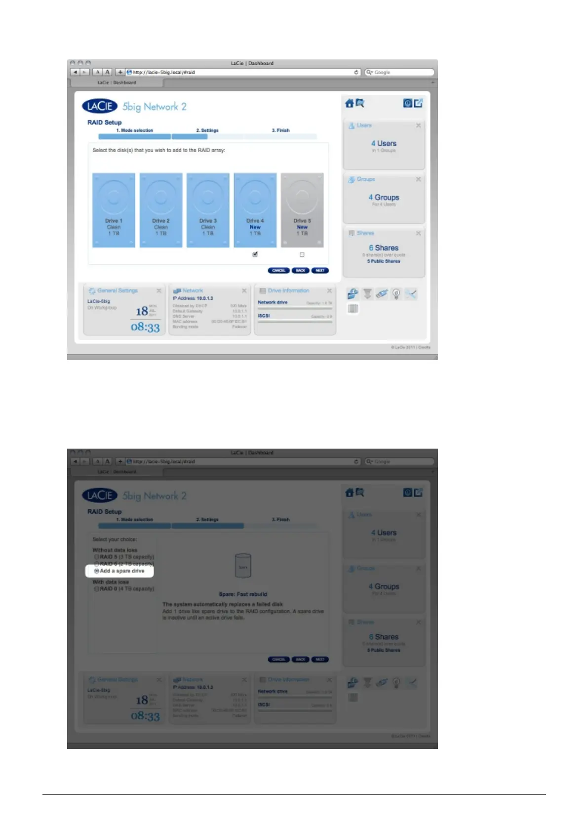 Choose a RAID level, then click NEXT. Note that you can choose to add the new disk as a spare. If you3.