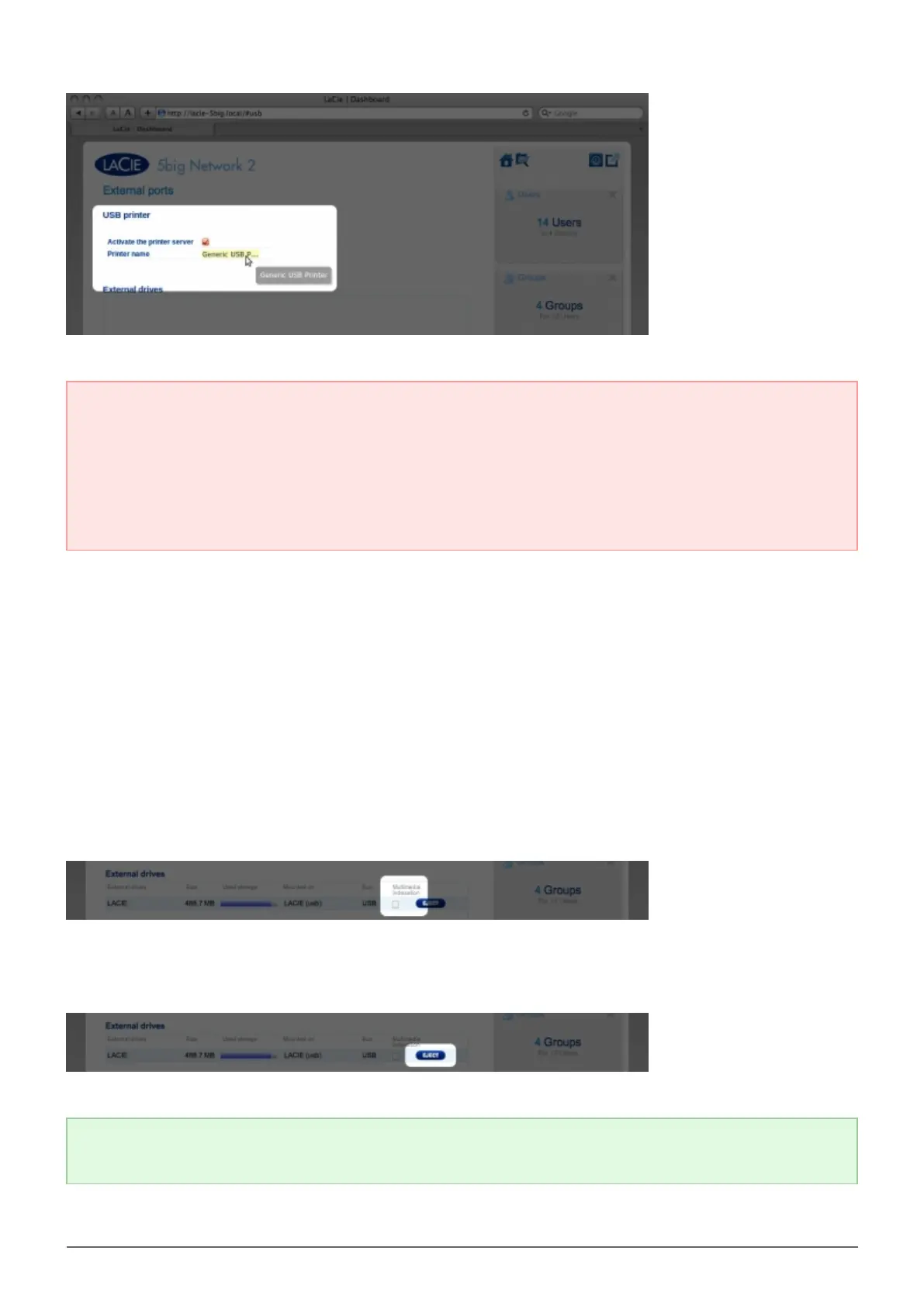 USB or eSATA hard drive connected to the LaCie NAS. Note that the Multimedia service must be activated on the