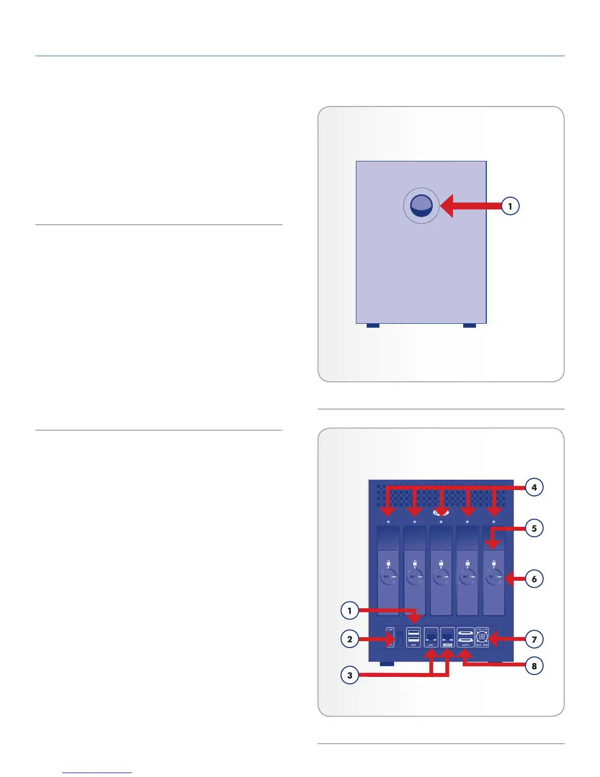 Button and Activity LED: The blue button stays on to show disk activ-