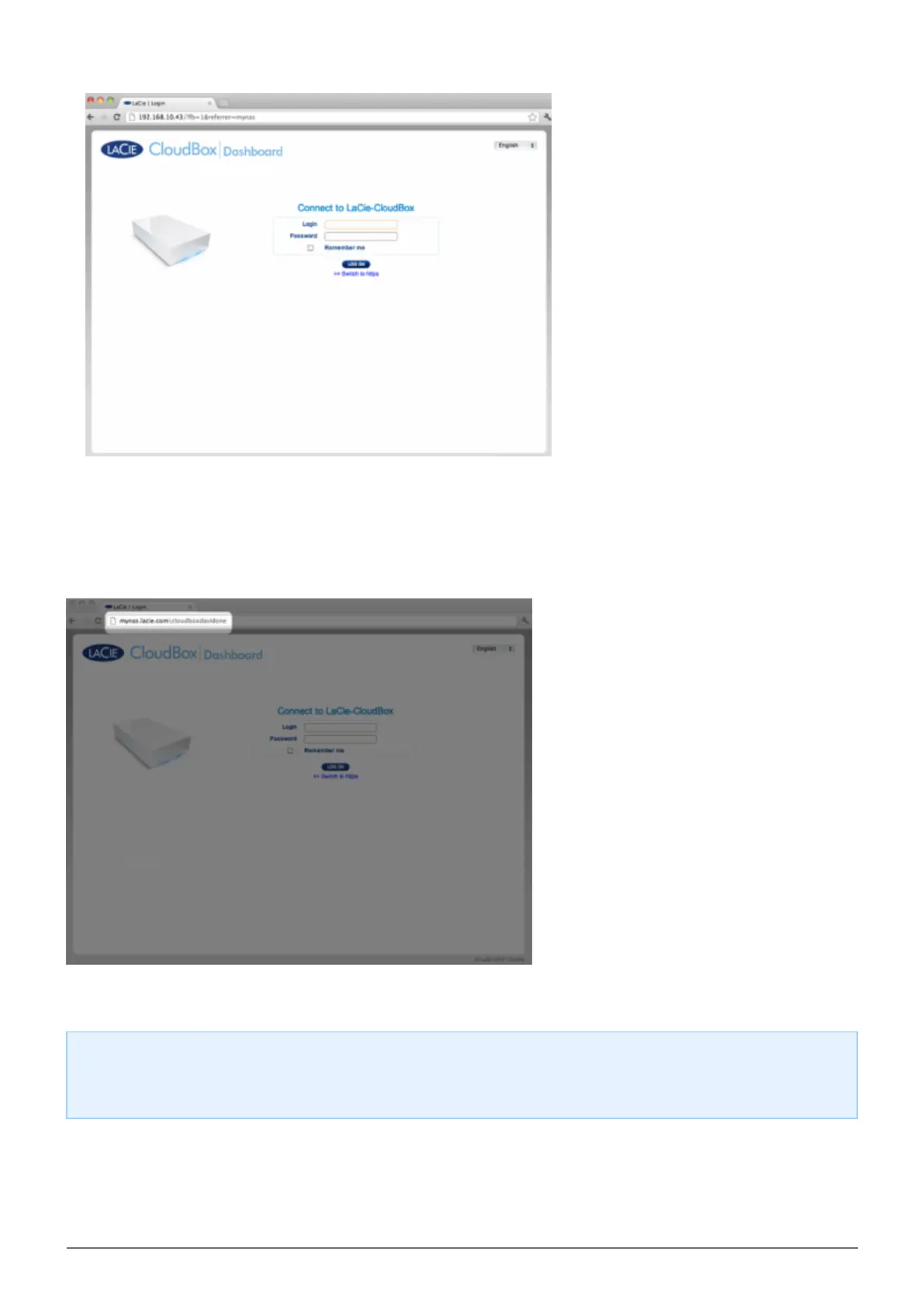 A more direct alternative to logging into LaCie MyNAS is to include your CloudBox nickname in the address bar: