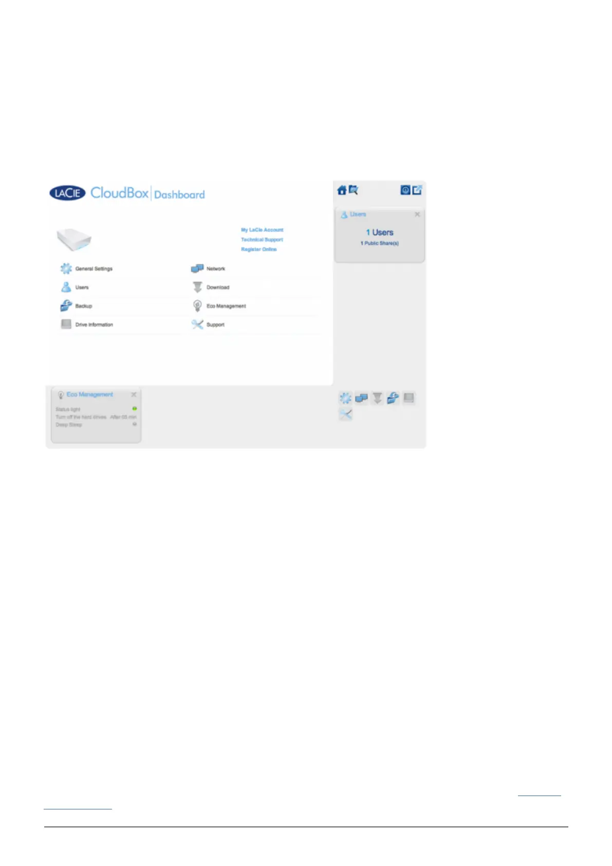 The Dashboard is the management tool for your LaCie CloudBox. In addition to simple management tasks such