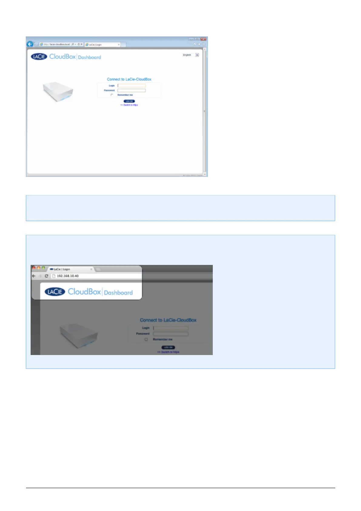 If you purchased more than one LaCie CloudBox, the default login names to type into the browser address bar