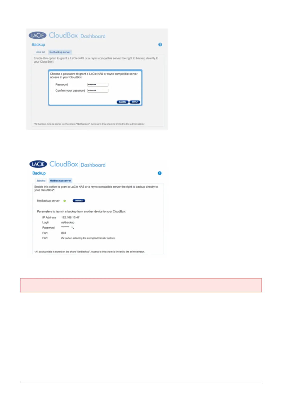 The NetBackup Share can only be accessed by the administrator of the CloudBox/NAS.