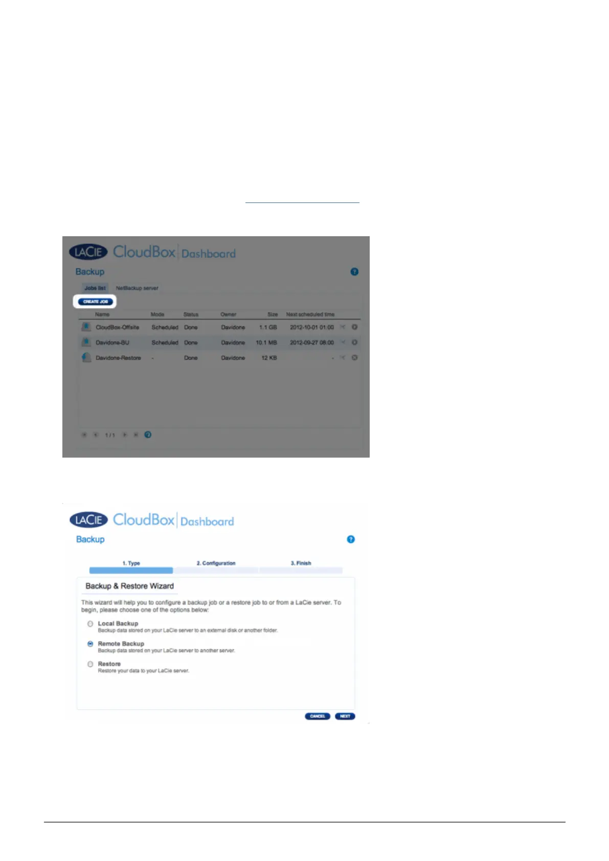Go to your LaCie CloudBox Dashboard (Log on to the Dashboard) to select the Backup page.1.