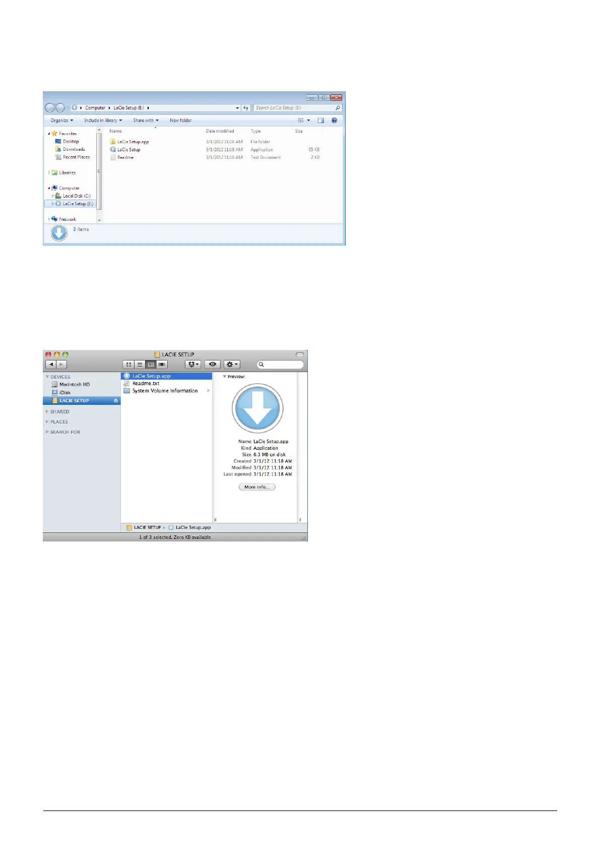 Manual access: Open the LACIE SETUP volume in Computer (My Computer for Windows XP) and double-click