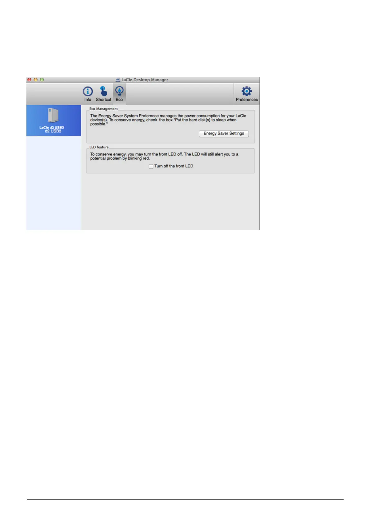 The Mac OS manages the power-saving mode for external devices. Choose Energy Saver Settings in LaCie