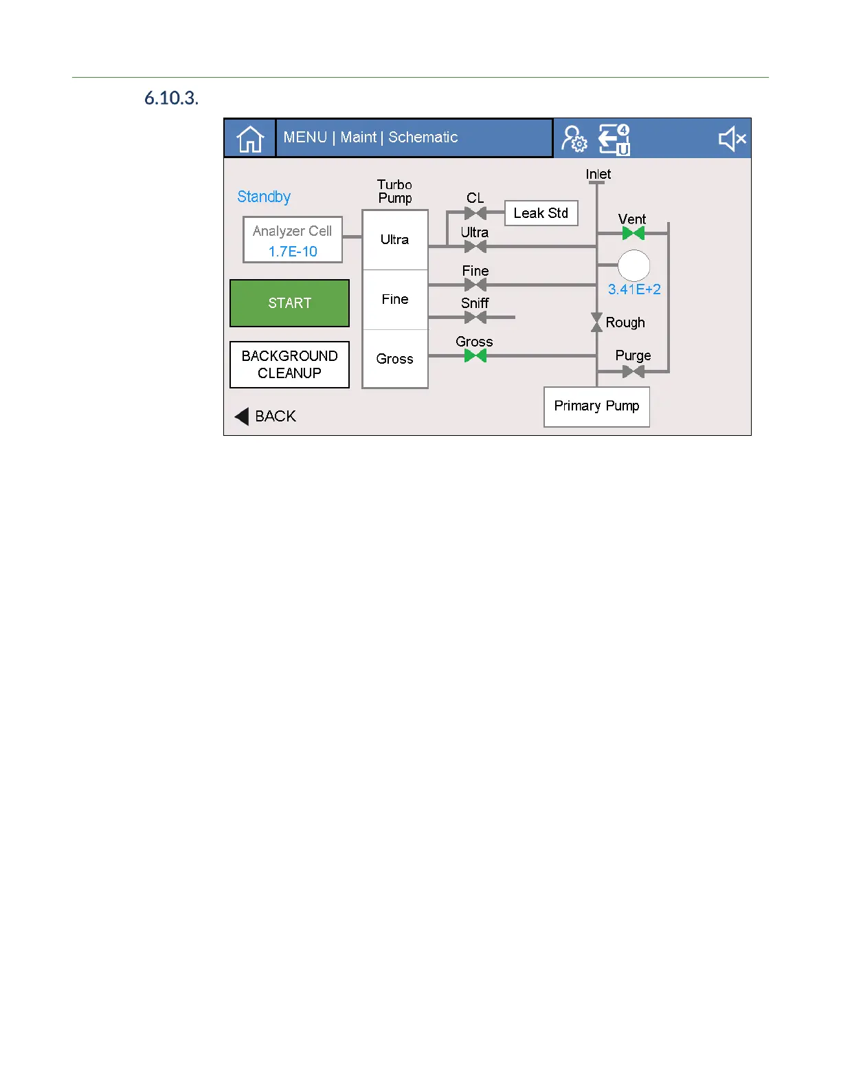 • Vacuum schematic view of leak detector. User can run a test cycle or calibration to